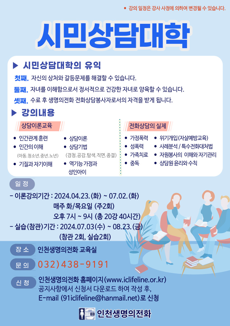 * 기타문의 : 032-438-9191 (인천생명의전화 사무국)
