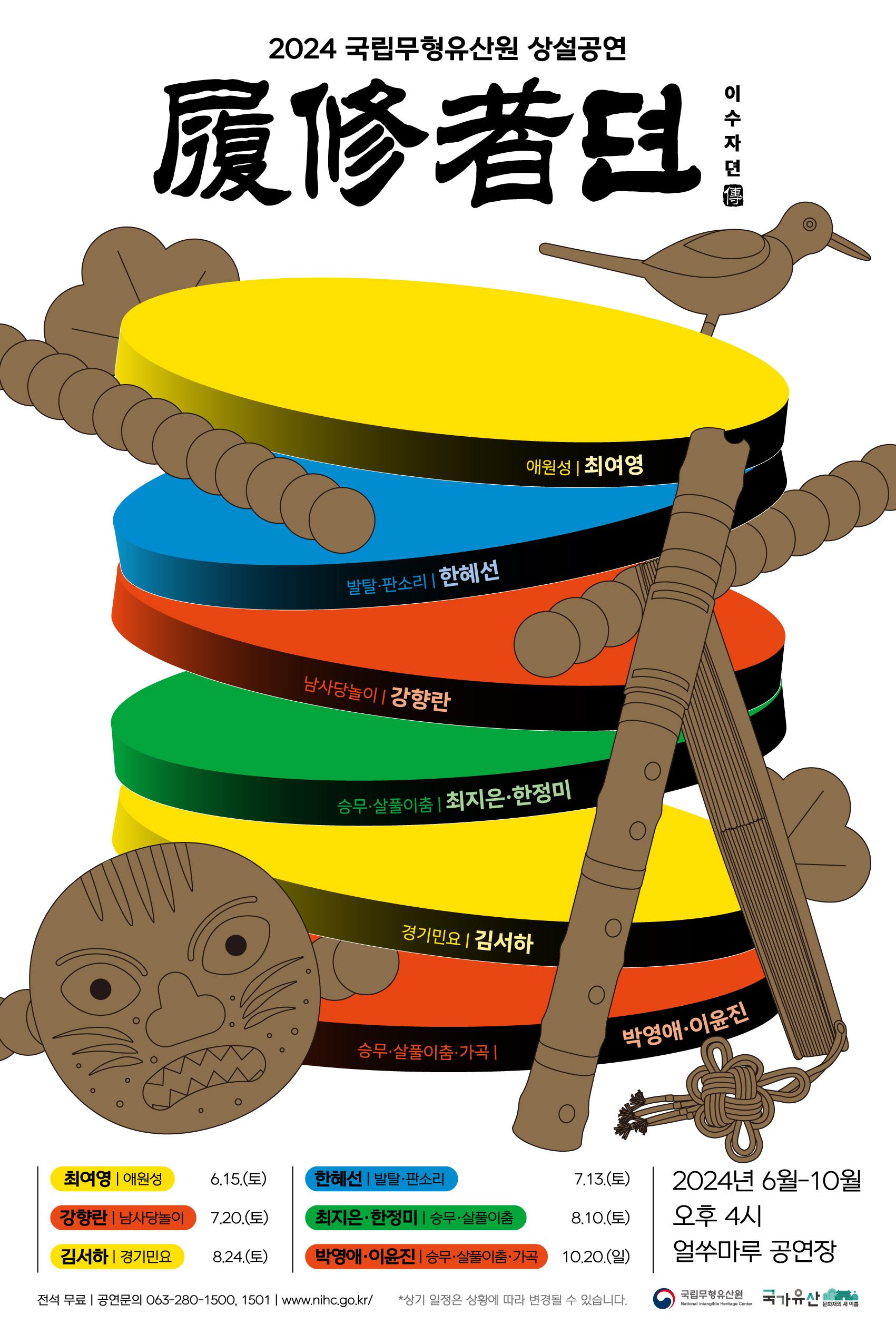 이수자뎐_포스터.jpg 이미지 2024 국립무형유산원 상설공연 이수자뎐 | 6.15 (토) 최여영-애원성 | 7.13 (토) 한혜선-발탈 | 7.20 (토) 강향란-남사당놀이 | 8.10 (토) 최지은, 한정미-살풀이춤 및 승무 | 8.24 (토) 김서하-경기민요 | 10.20 (일) 박영애, 이윤진-살풀이춤, 승무 및 가곡 | 전석무료 | 예약 문의 063-280-1500, 1501 www.nihc.go.kr/ | ※각 프로그램은 상황에 따라 변동될 수 있습니다.