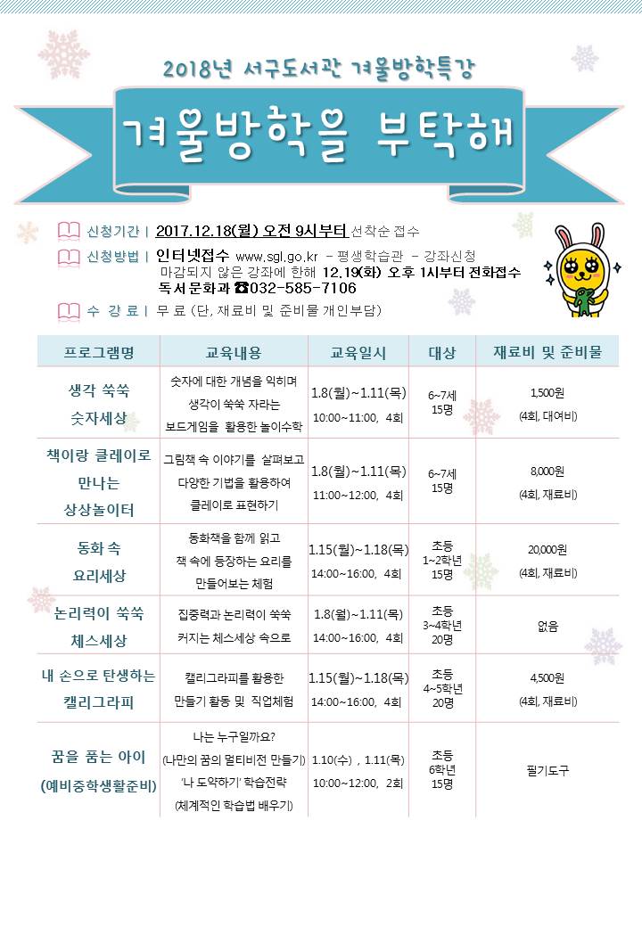 ※서구도서관 2018년 겨울방학특강 참가자 모집 ※ 1. 신청기간 : 2017.12.18(월) 오전 9시부터 선착순 접수