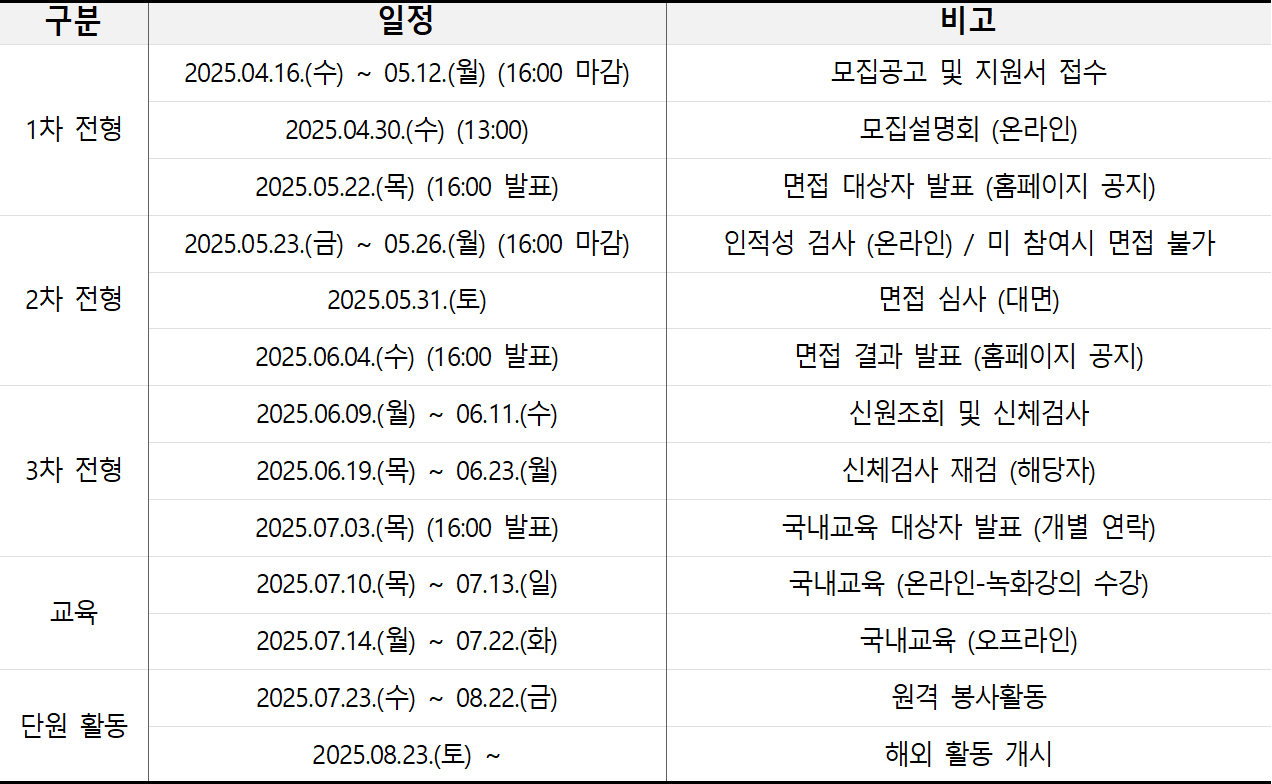 * 봉사정신이 투철한 만 19세 이상~ 만 34세 대한민국 국적을 가진 자※ 지원자 연령은 지원서 접수 마감일인 2025.05.15. 기준
