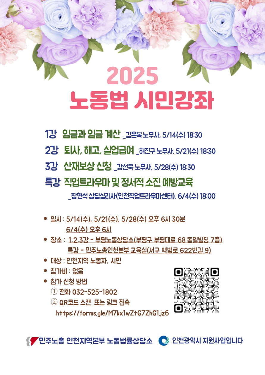 일하면서 살아가는 시민들에게 꼭 필요한 노동법만 골라 민주노총인천본부 노동법률상담소에서 무료강좌를 진행합니다. 관심있는 분들의 많은 참여 부탁드립니다.