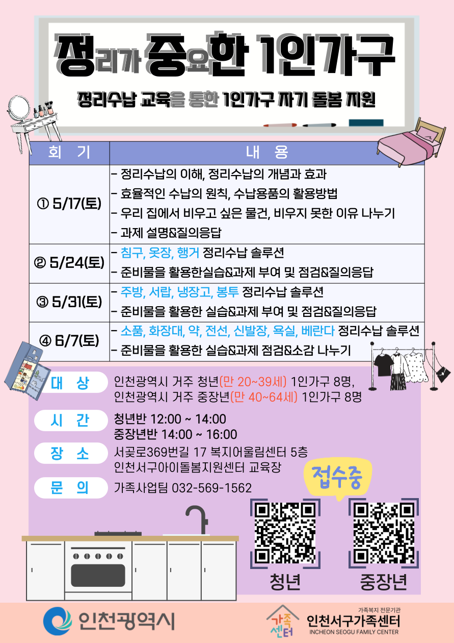 안녕하세요 인천서구가족센터 1인가구 사업 담당자입니다