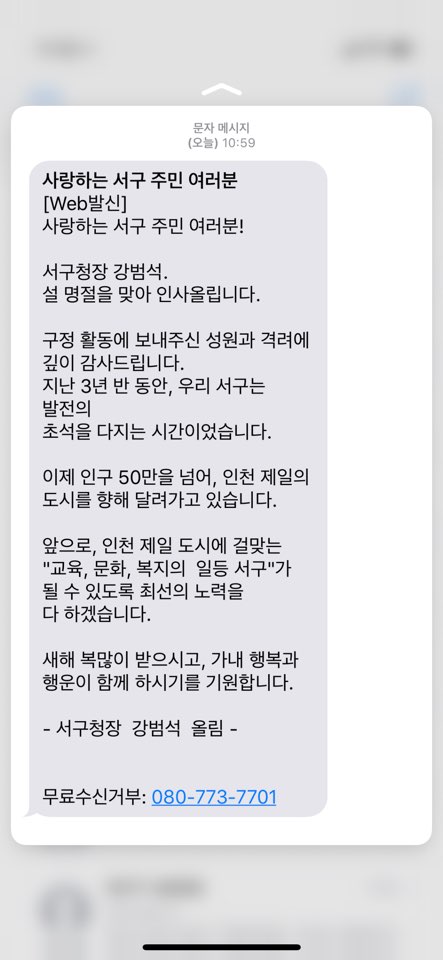 예전 지방선거철부터 부단히도 문자를 보내시더니... 계속 번호 차단해도 명절이다 시즌마다 여전히 잘보내주시네요... 참고로 전 인천 살지도 않으며, 직장도 인천과는 거리가 먼 용인입니다. 개인정보를 어떻게 입수했는지는 모르겠지만 동의도 없이 그만 좀 보내십시오 정중하게 말씀드립니다. 제가 이런글 쓰지 말게 해주십시오...