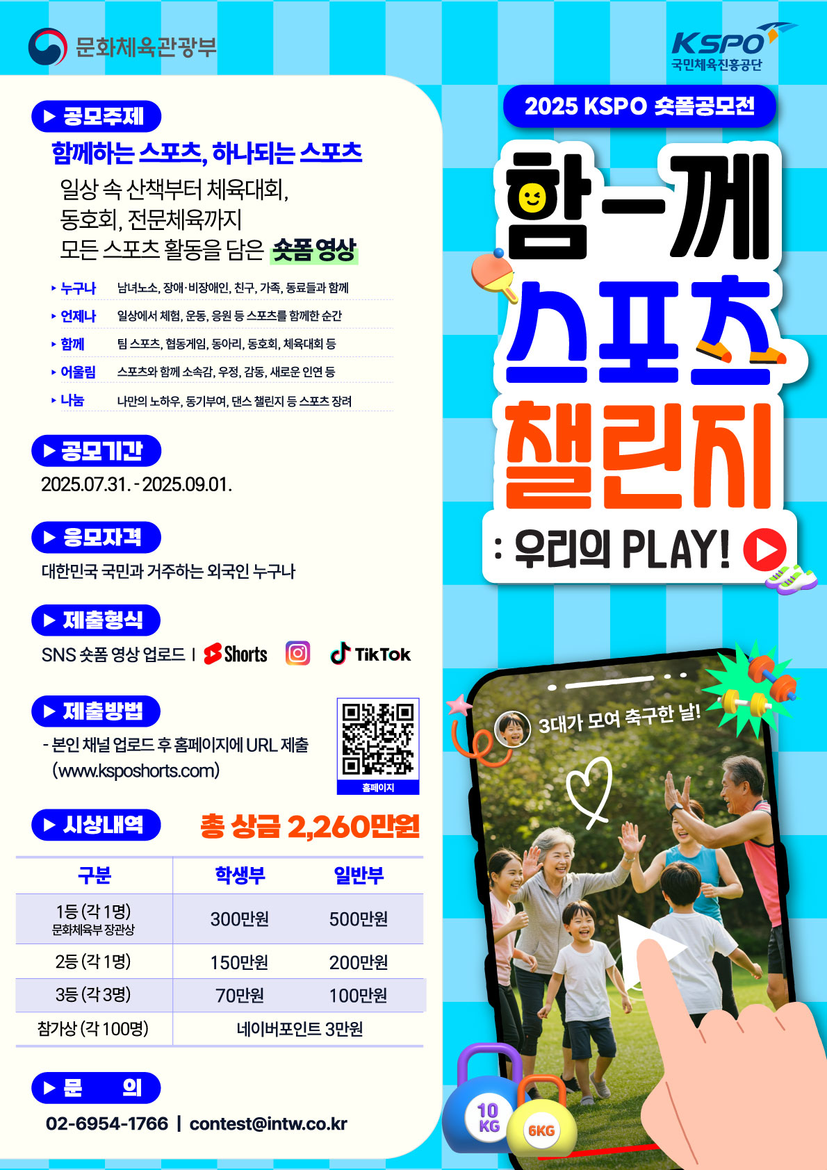 문화체육관광부와 KSPO가 함께하는 '2025 KSPO 숏폼 공모전: 함께 스포츠 챌린지!'에 참여하세요.