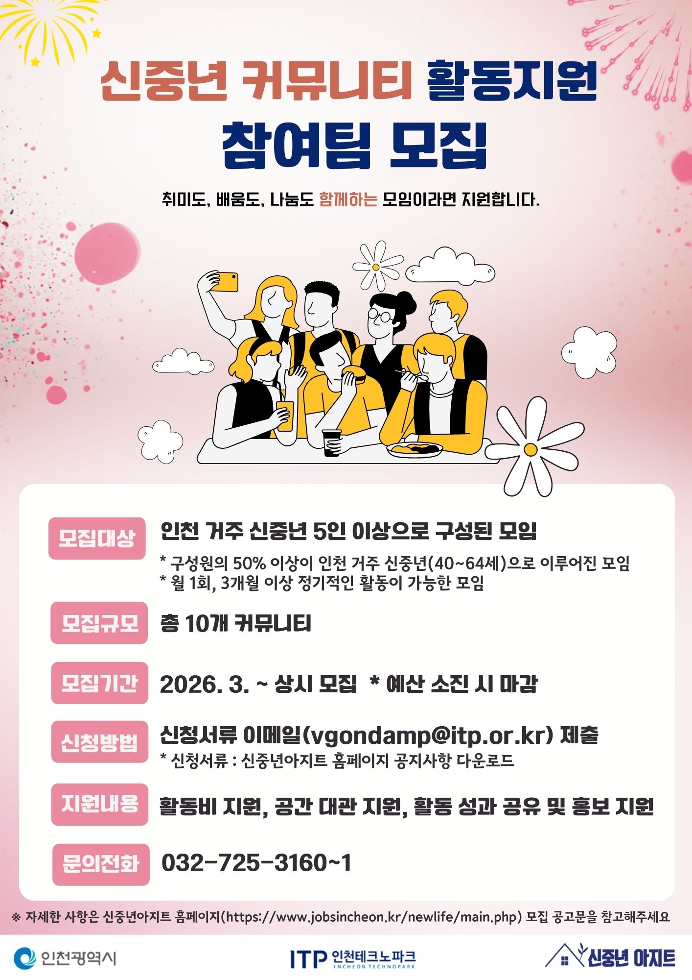 인천광역시와 인천테크노파크 일자리센터(신중년아지트)는 신중년의 사회적 고립을 완화하고 지역사회 연계를 강화하기 위하여, 신중년의 자발적 커뮤니티 활동을 지원하는 「신중년 커뮤니티 활동지원」 사업을 운영합니다. 이에 본 사업에 참여할 신중년 커뮤니티를 아래와 같이 모집하오니, 관심 있는 신중년 모임의 많은 관심과 참여를 바랍니다.