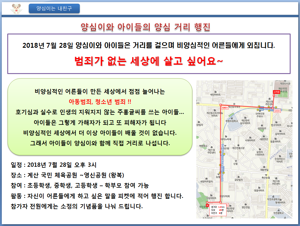 양심이 활동이 점점 활발해지면서 이번 7월 28일에 아이들과 함께 거리 행진을 진행 하려고 합니다.