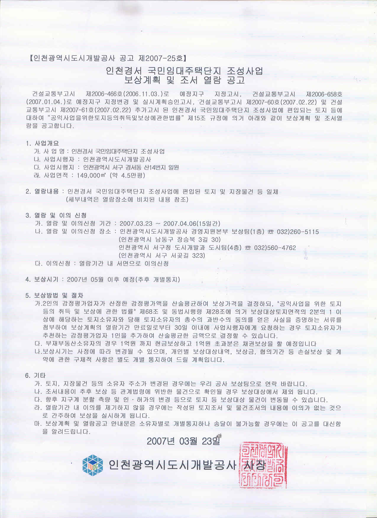 인천경서 국민임대주택단지 조성사업에 편입되는 토지 등에 대하여 "공익사업을 위한 토지등의 취득 및 보상에 관한 법률" 제15조 규정에 의거 붙임과 같이 보상계획 및 조서 열람을 공고합니다.