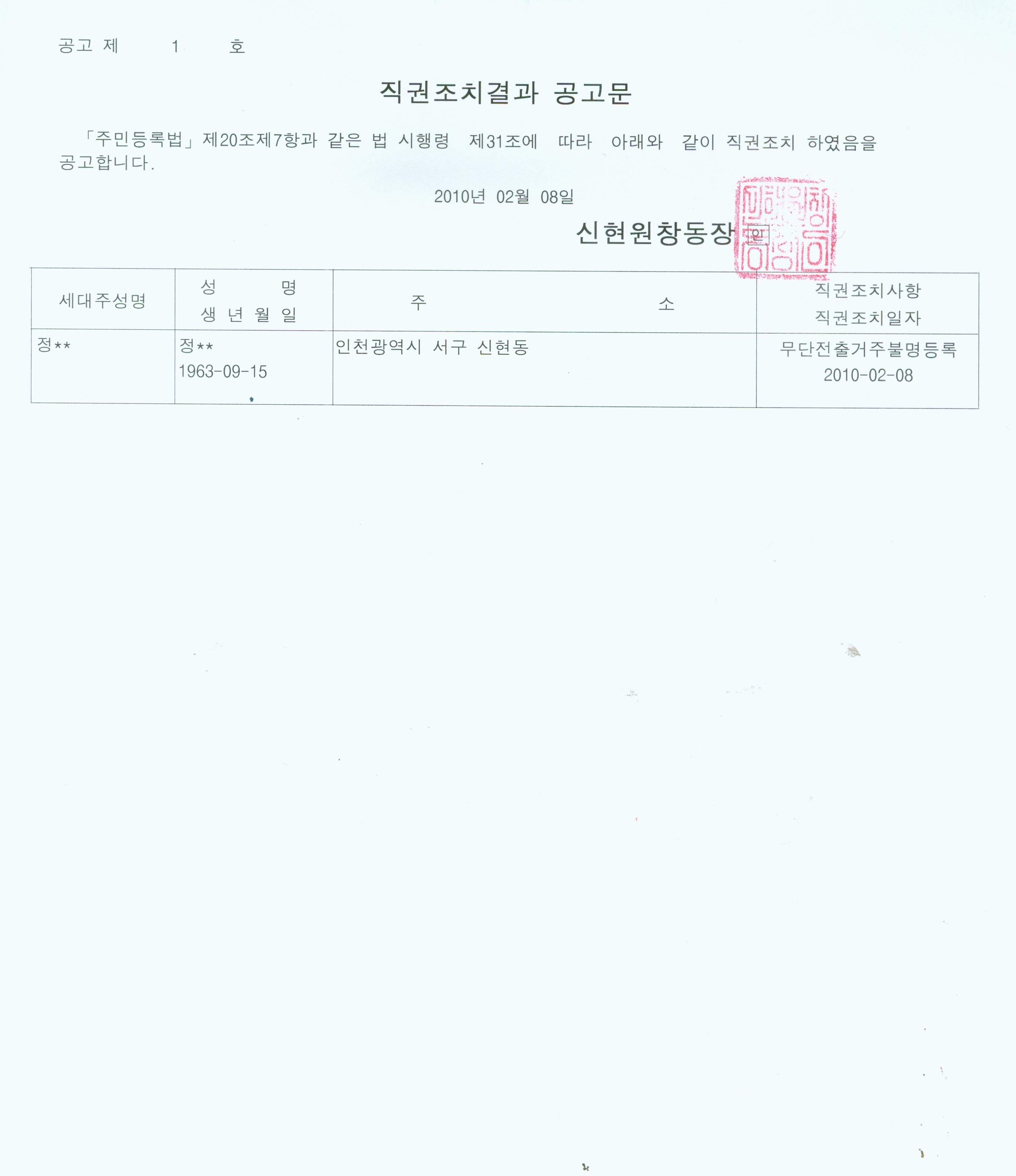 무단전출자에 대하여 주민등록법 제20조제7항 및 동법 시행령 제31조 규정에 의거 아래와 같이 직권조치하였음을 공고합니다.