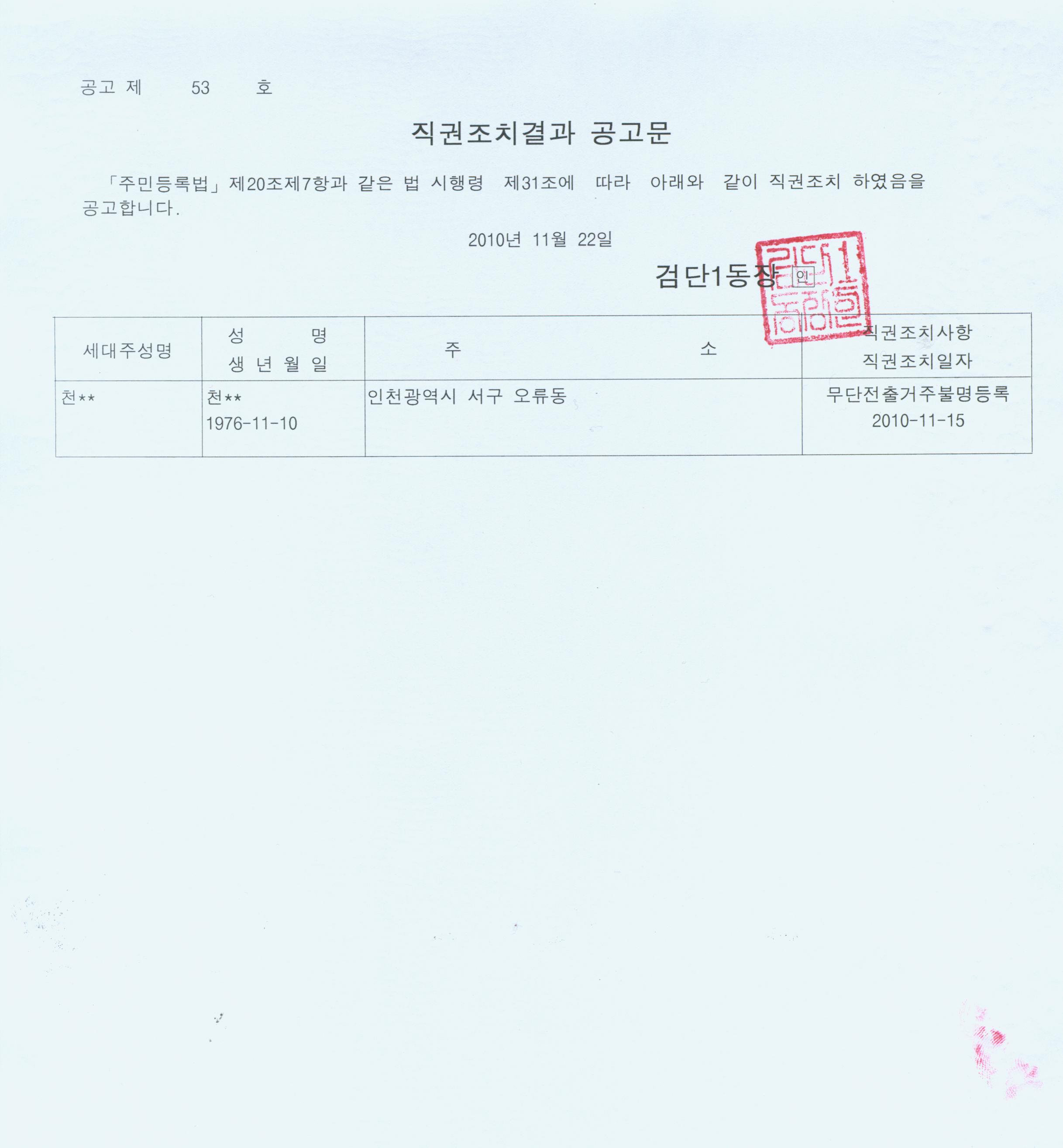 1. 직권조치대상자 : 천 * *(인천 서구 오류동)