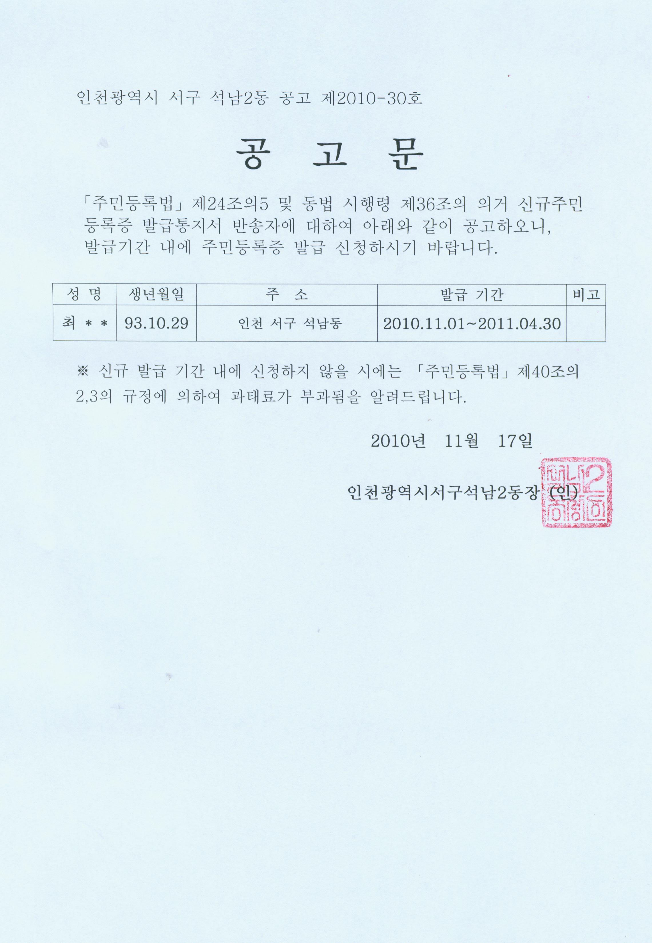 주민등록법 제24조의 5및 동법시행령 제36조에 의거, 신규주민등록증 발급통지서 반송자에 대하여 붙임과 같이 동 게시판 및 홈페이지에 공고합니다.