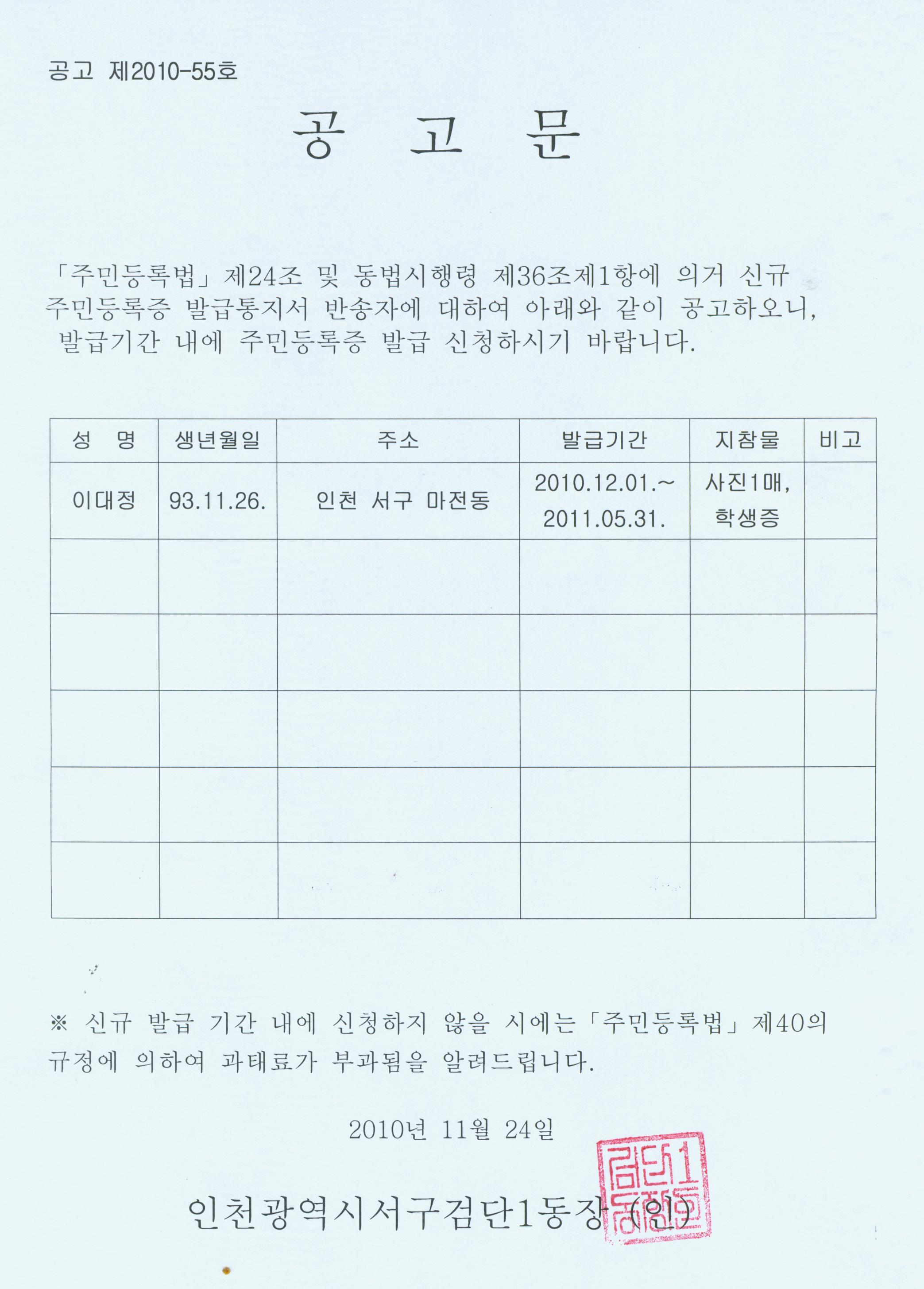 신규주민등록증 발급 대상자에 대하여 주민등록법 제24조 및 동법시행령 제35조에 의거 발급신청 안내를 통지하였으나, 수취인 부재 등으로 발급통지서가 반송된 대상자에 대하여 주민등록법시행령 제36조제1항에 의거 붙임과 같이 공고하고자 합니다.