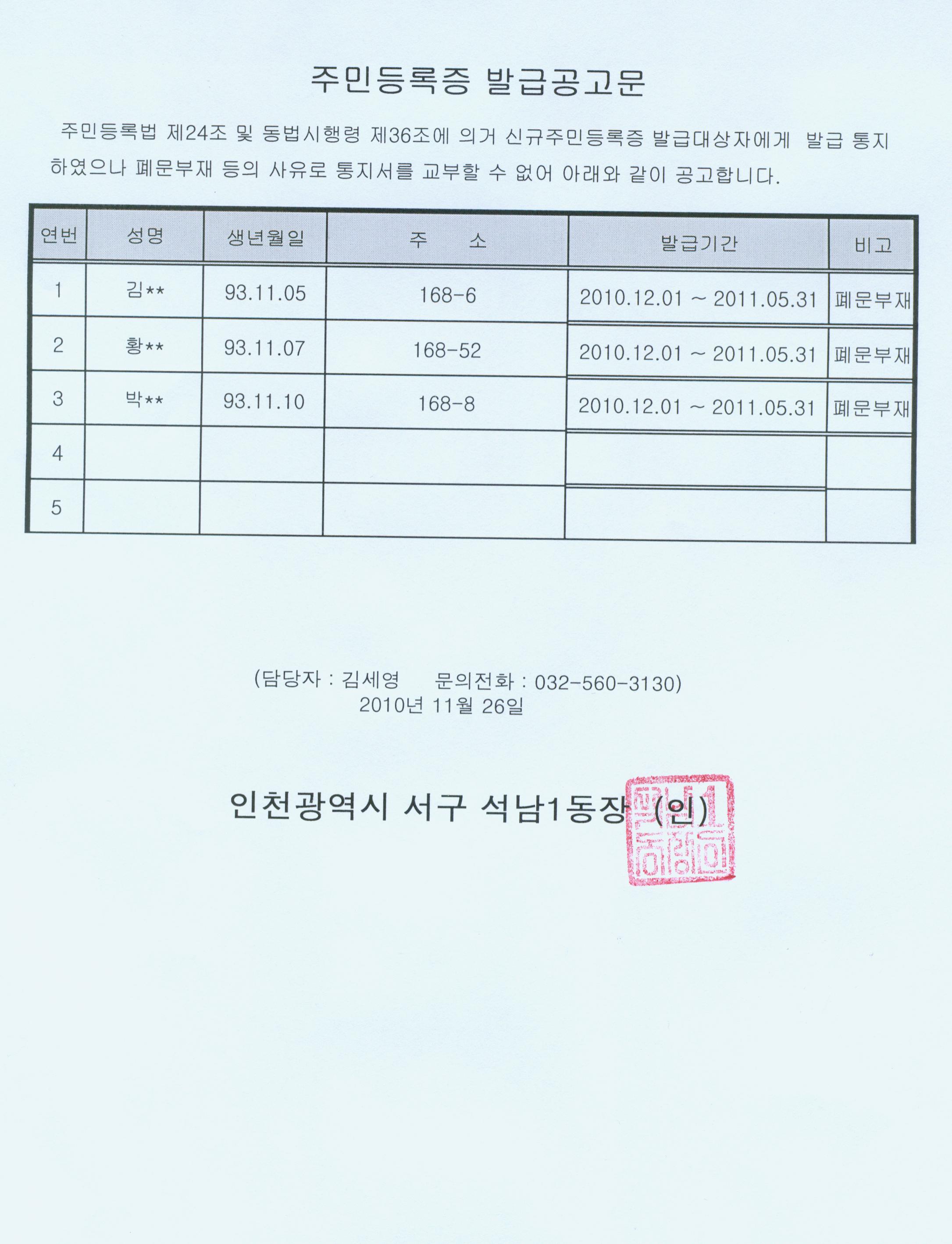 주민등록법 제24조의 5및 동법시행령 제36조에 의거, 신규주민등록증 발급통지서