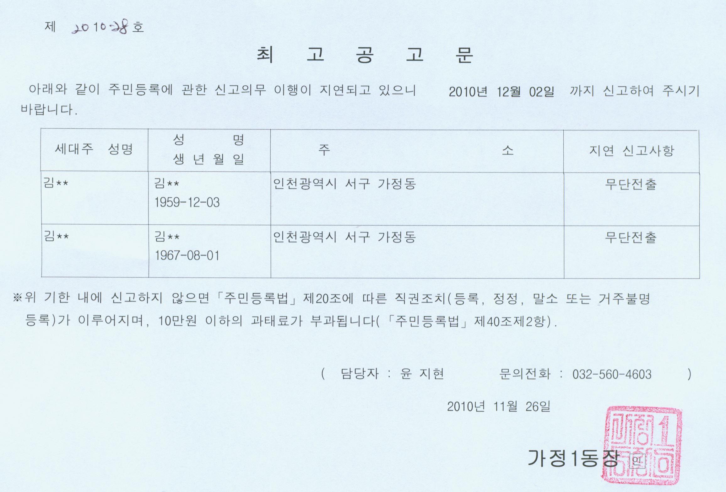 2. 거주지이전 신고의무를 위반한 무단전출자에 대하여 주민등록법 제20조2항에 규정에 의거, 신고의무자에게 사실대로 신고할 것을 최고하였으나, 이사, 수취인 불명 등의 사유로 최고장을 전달할 수 없는 자에 대하여, 주민등록법 제20조3항의 규정에 의거 다음과 같이 공고하고자 합니다.