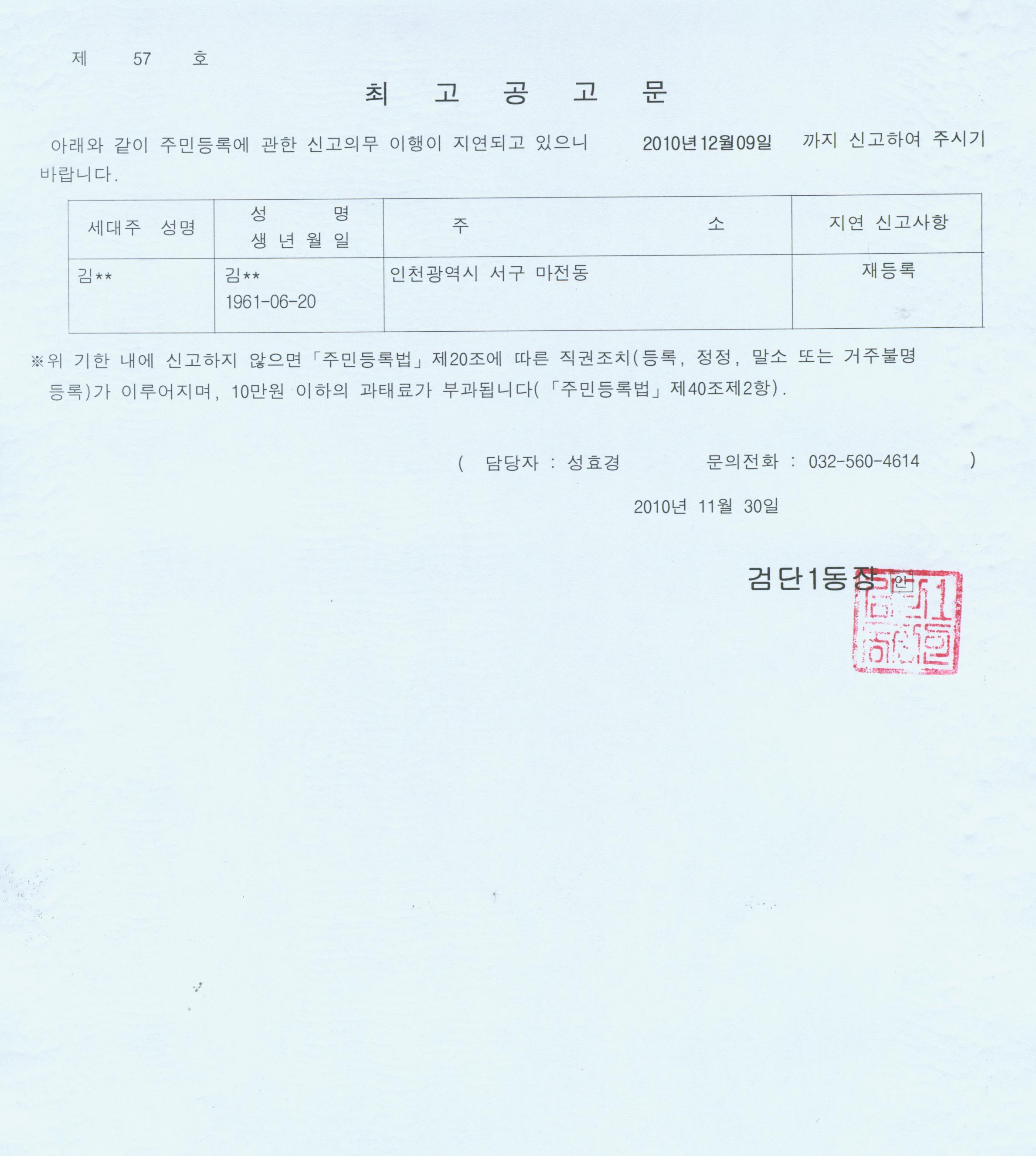 주민등록 최종신고주소지가 행정상 관리주소(검단1동 주민센터 주소)로 이전됨을 공고하고자 합니다.