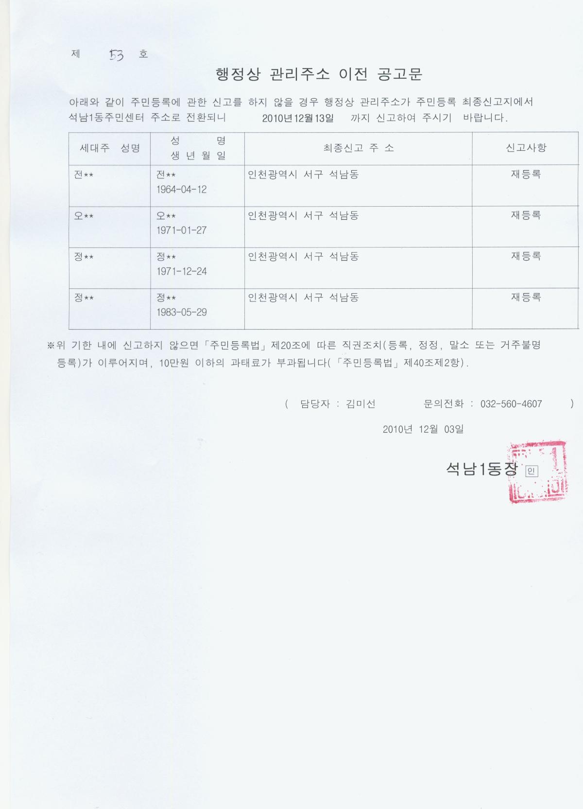 대상자에 대하여 행정상 관리주소 이전(전환) 사항을 공고합니다.