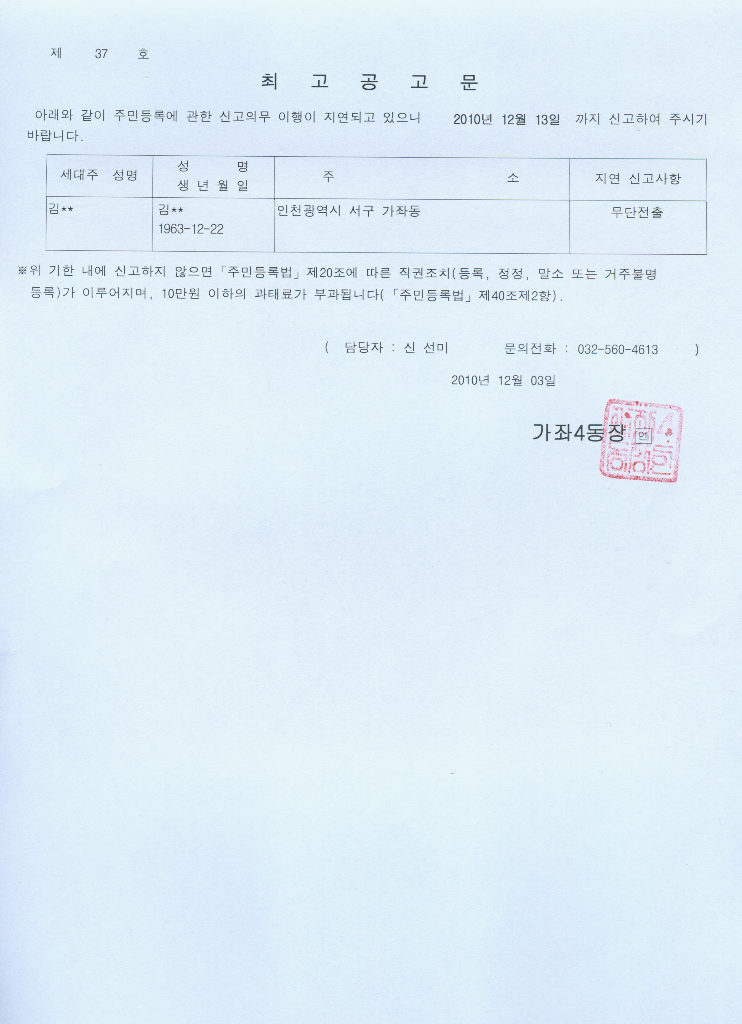 주민등록법 제20조 제2항의 규정에 의거 주민등록 무단전출자에 대하여 최고하였으나