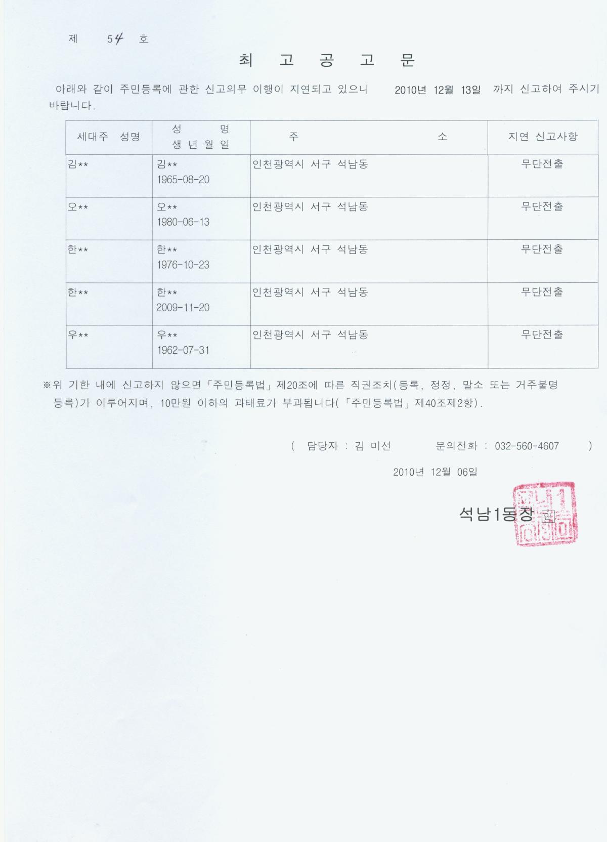 주민등록법 제20조3항 및 동법시행령 제28조2항에 따라 주민등록 무단전출자에