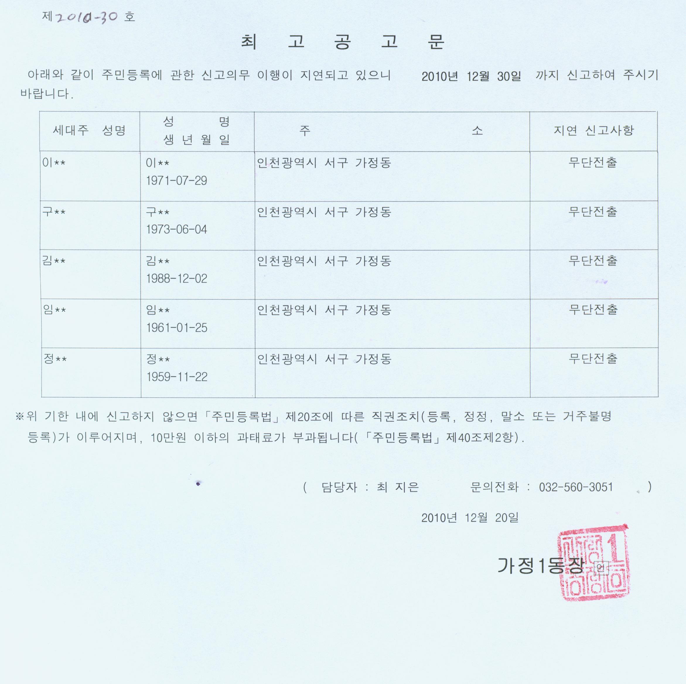 2. 거주지이전 신고의무를 위반한 무단전출자에 대하여 주민등록법 제20조2항에 규정에 의거, 신고의무자에게 사실대로 신고할 것을 최고하였으나, 이사, 수취인 불명 등의 사유로 최고장을 전달할 수 없는 자에 대하여, 주민등록법 제20조3항의 규정에 의거 다음과 같이 공고하고자 합니다.