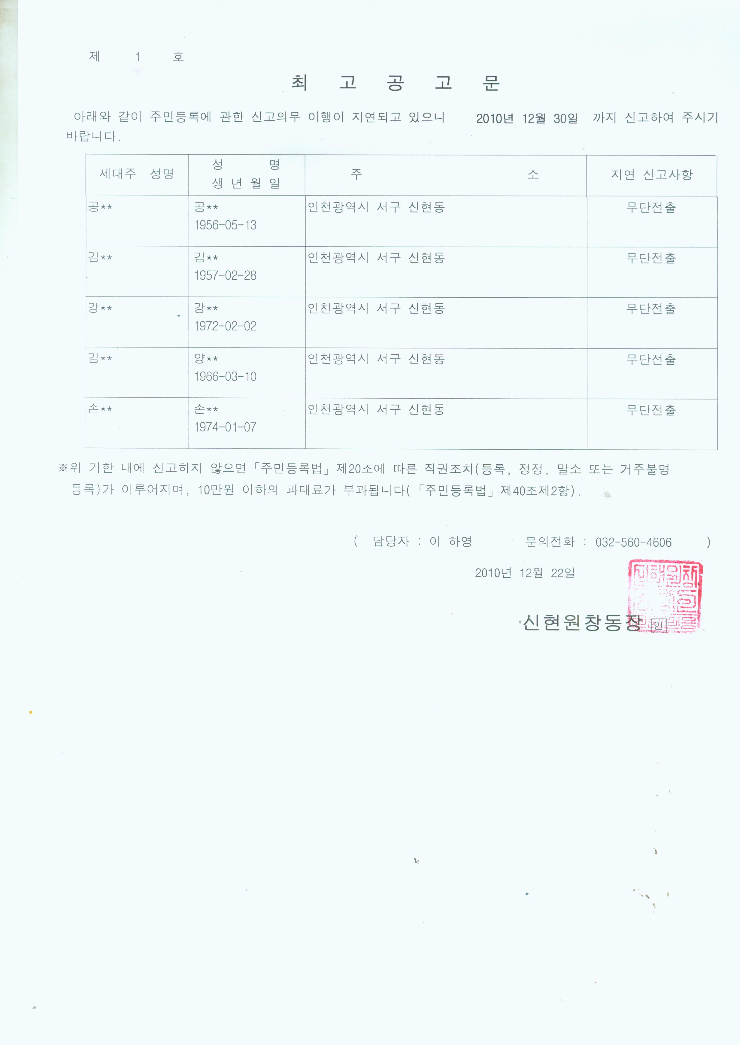 2010년도 4분기 주민등록 일제정리와 관련하여 주민등록 사실조사 후 무단전출자에 대하여 주민등록법 제20조제3항 및 동법시행령 제28조제2항에 의거 아래와 같이 공고를 실시하고자 합니다.