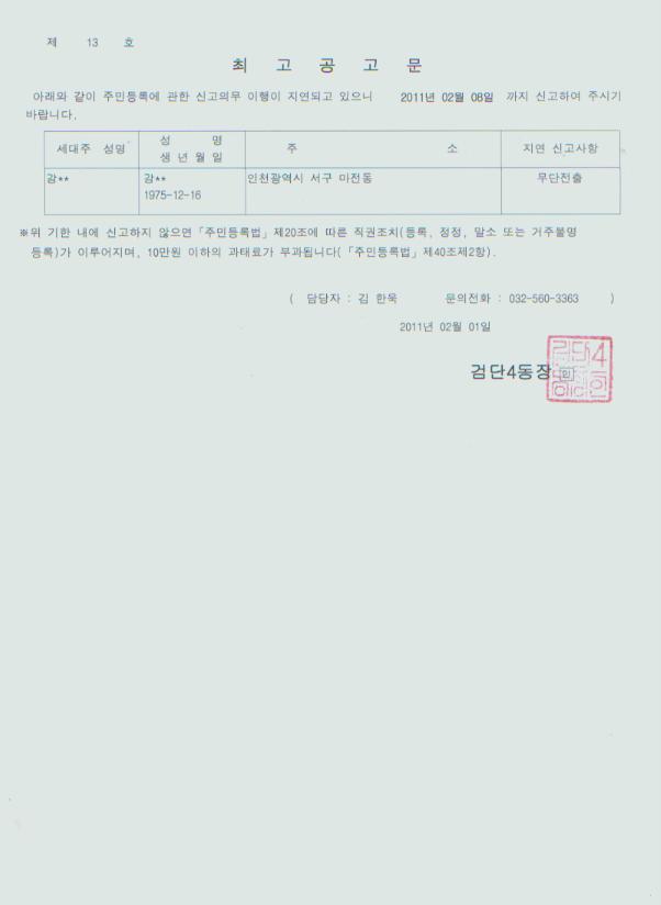 2009.10.02 이후 거주불명등록자에 대한 1차 최고 공고