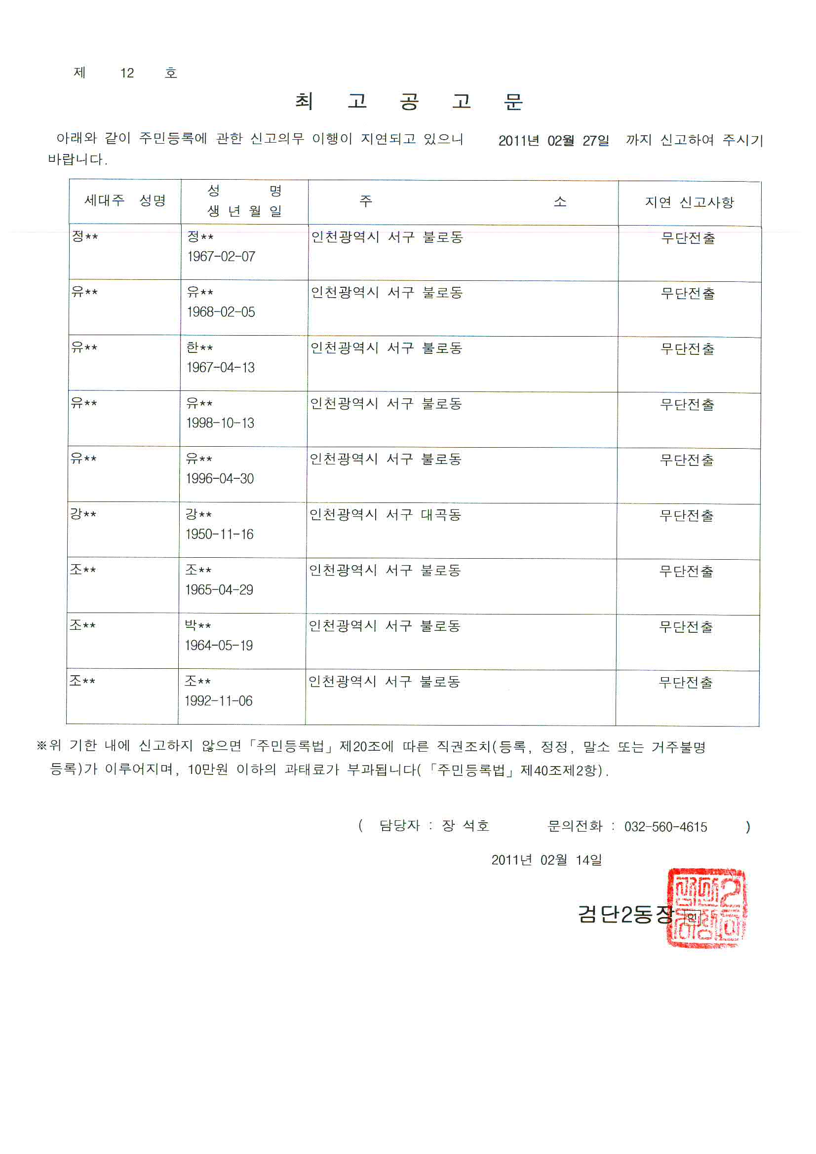 주민등록법 제20조의3 및 동법시행령 제28조의 규정에 의거 일정기간 내에 신고하도록 최고를 하였기에 아래와 같이 해당 무단전출자에 대해 공고합니다.