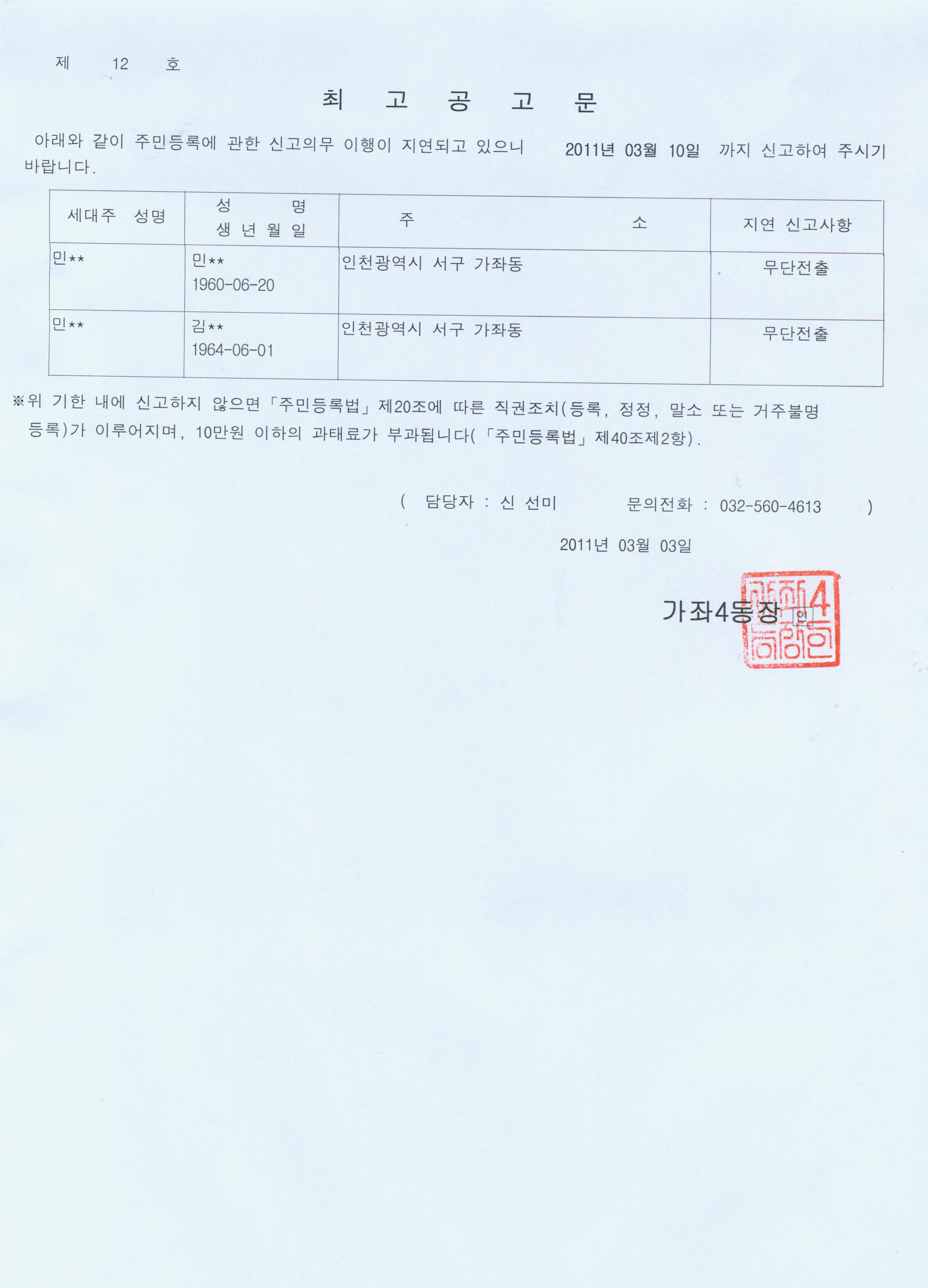 주민등록법 제20조 제2항의 규정에 의거 주민등록 무단전출자에 대하여 최고하였으나