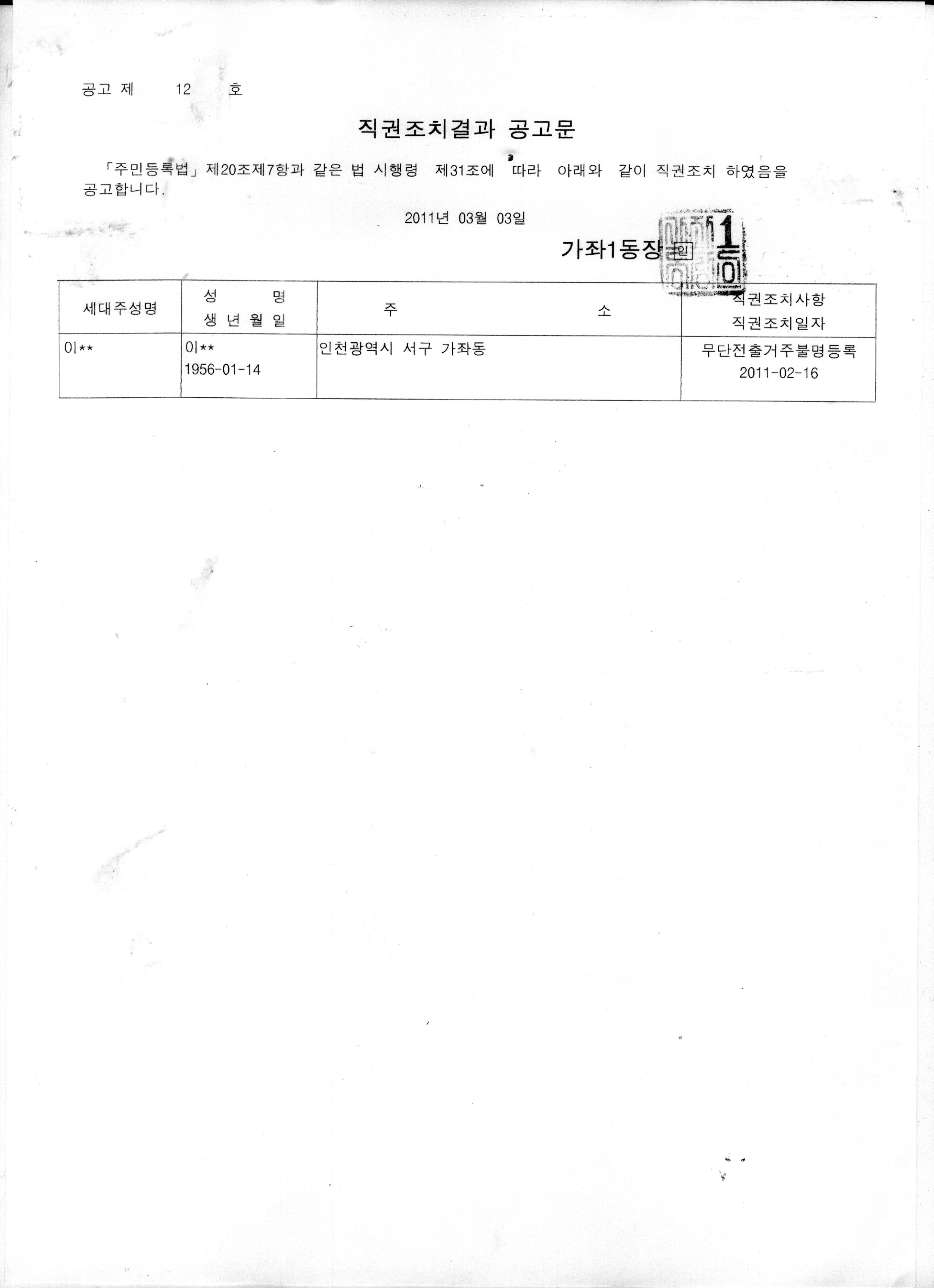 주민등록법 제20조제6항과 동법시행령 제31조에 의거 붙임과 같이 무단전출자 직권조치하였음을 공고코자 합니다.