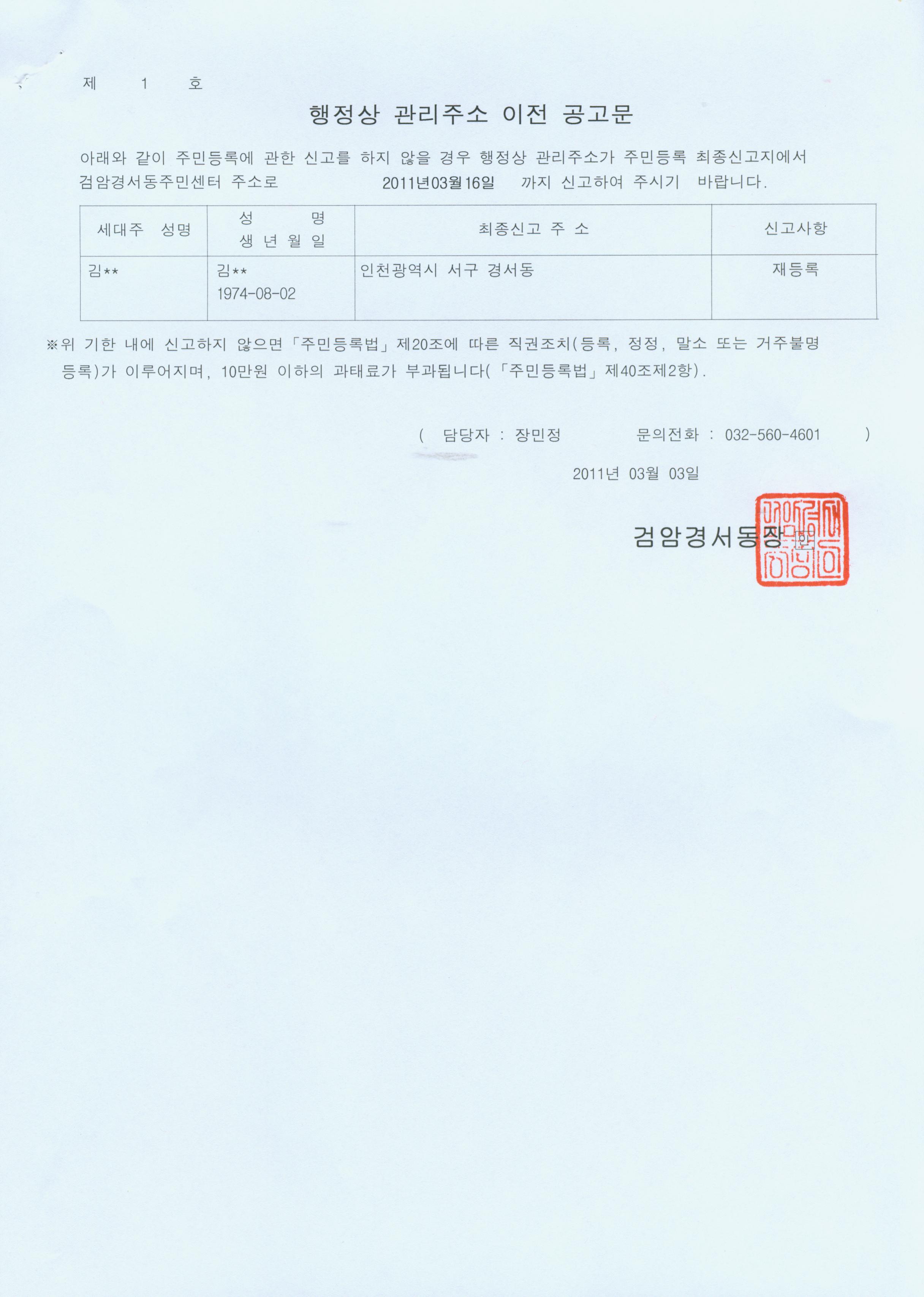주민등록법 제20조제6항 규정에 의거 거주불명등록 수 1년이 경과한 2010.02.01.~ 2010.02.28. 거주불명등록자들에 대하여 아래와 같이 행정상 관리주소를 검암경서동 주민센터로 이전하기 위하여 1차 공고코자 합니다.