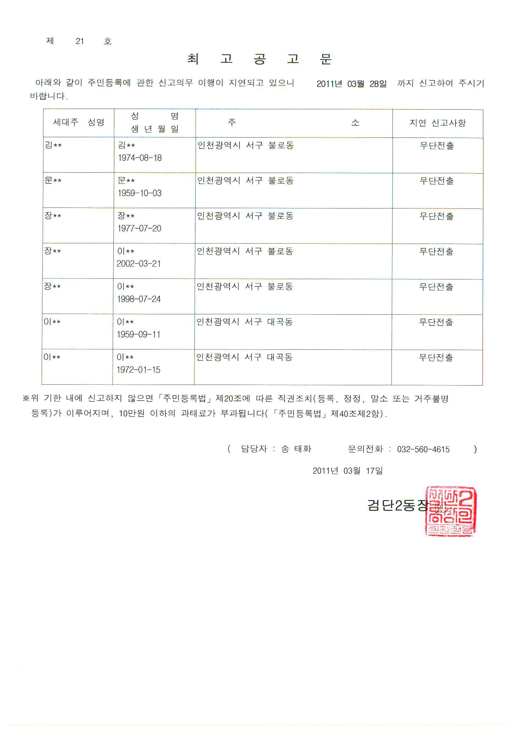 주민등록법 제20조의3 및 동법시행령 제28조의 규정에 의거 일정기간 내에 신고하도록 최고를 하였기에 아래와 같이 해당 무단전출자에 대해 공고합니다.