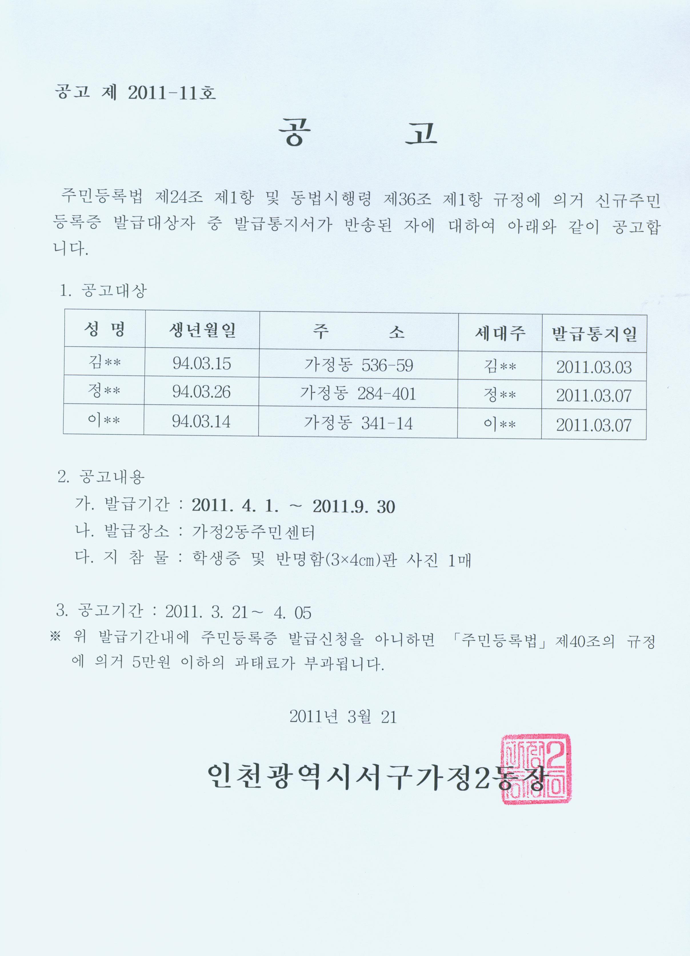 주민등록법 제24조제1항 및 동법시행령 제36조제1항의 규정에 의거 아래와 같이 신규주민등록증 발급통지서 반송에 따른 공고를 [홈페이지][게시판]에 게재 하고자 합니다.