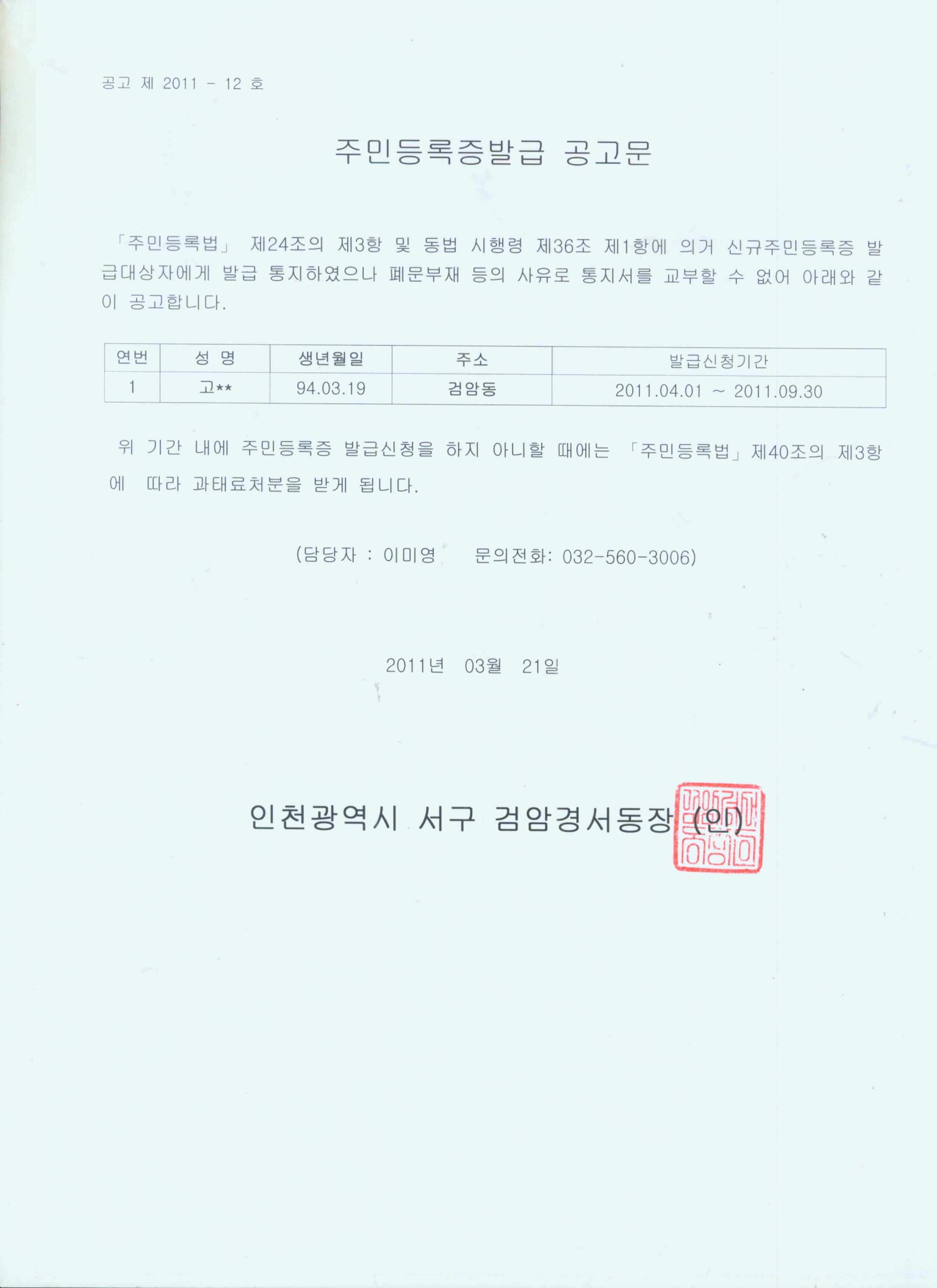 94년 3월생 주민등록증 발급통지서 반송자에 대하여 주민등록법 제24조 제3항 및 동법 시행령 제36조 제1항에 따라 아래와 같이 공고하고자 합니다.