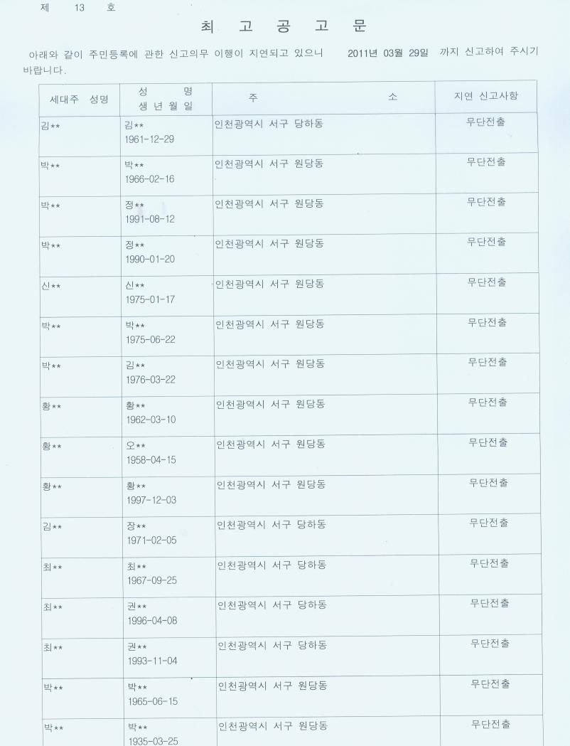 2011년도 주민등록일제정리 기간동안 거주지 이동 후 기일 내에 주민등록 주소변경 신고 불이행자에 대하여 최고장을 송부하였으나 수취인 미거주로 반송되어, 주민등록법 제20조 및 동법 시행령 제28조 규정에 의거 최고대상자를 아래와 같이 공고하고자 합니다.