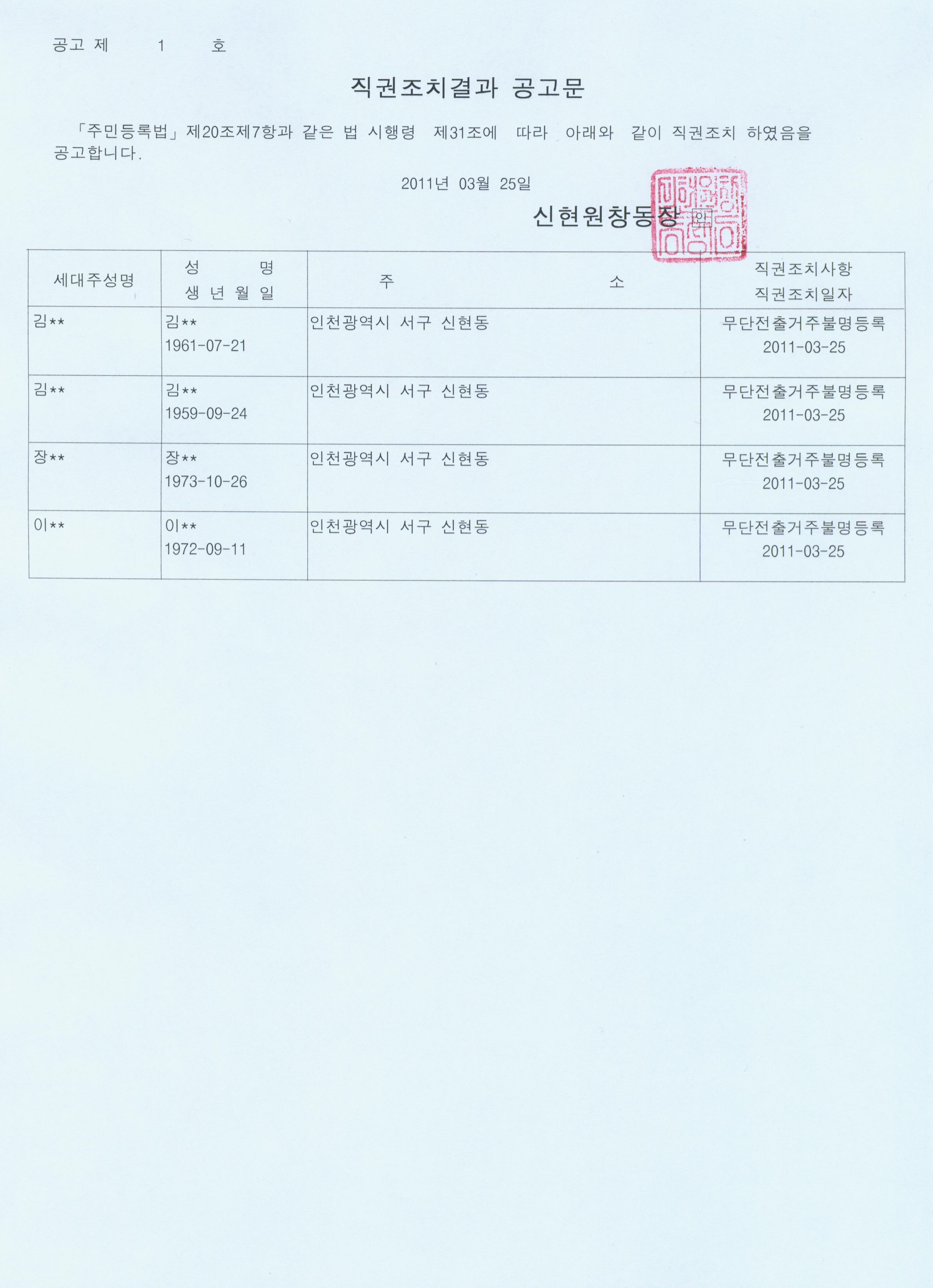 주민등록 무단전출자에 대하여 주민등록법 제20조제7항 및 동법시행령 제31조 규정에 의거 아래와 같이 직권조치 하였음을 공고하고자 합니다.