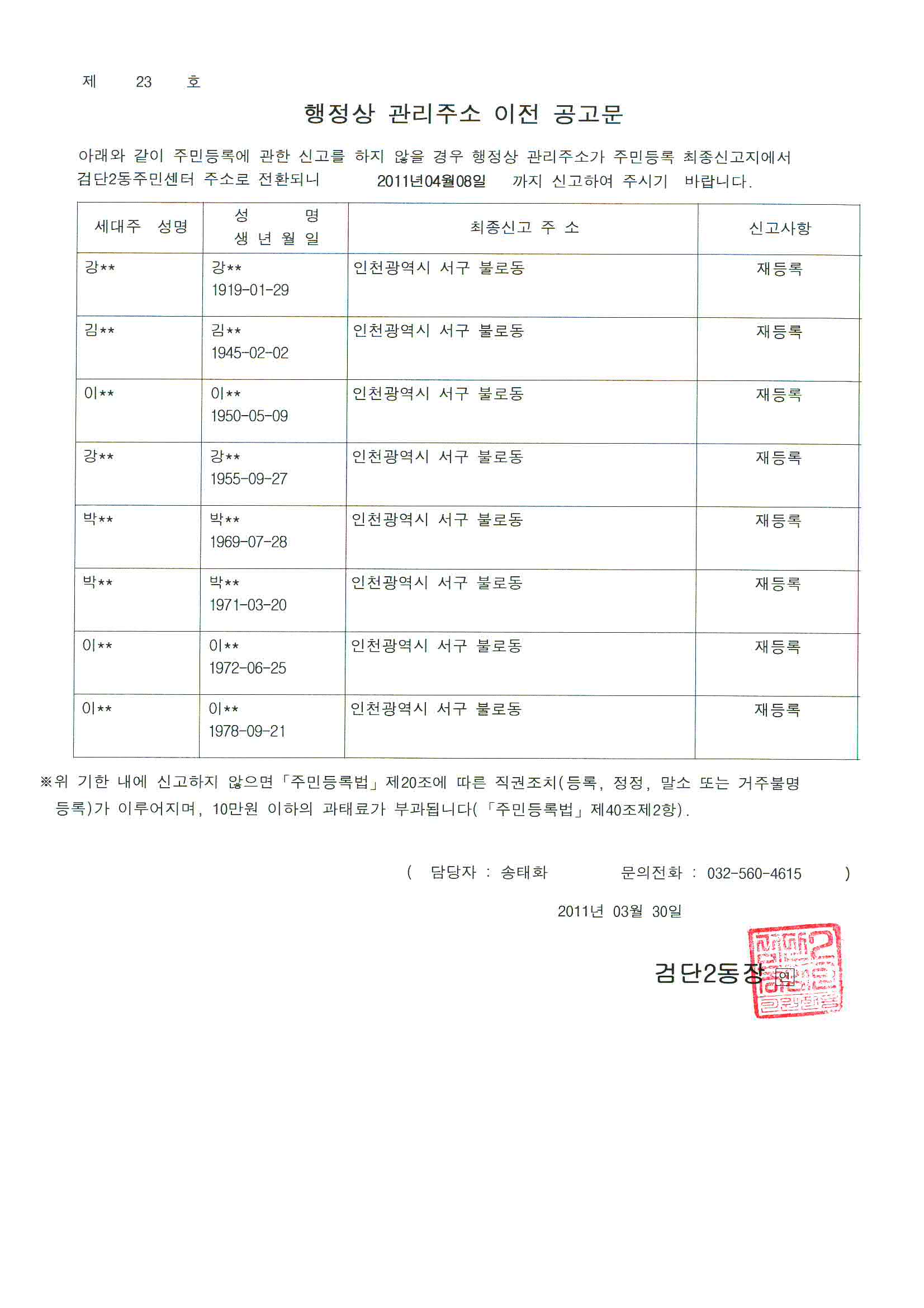 우리 동 거주자 중 거주불명등록 후 1년이 경과한 자에 대하여 주민등록법 부칙 제2조(종전 법률의 개정에 따른 거주불명등록에 관한 특례)에 따른 행정상 관리주소 이전계획을 붙임과 같이 공고하고자 합니다.