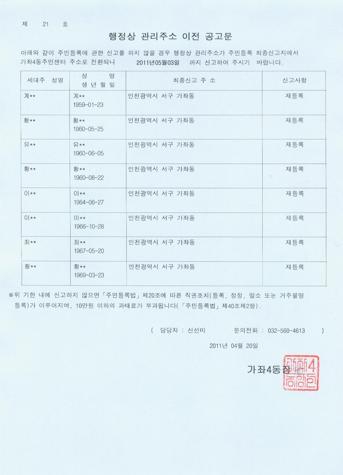 거주불명등록자에 대하여 아래와 같이 행정상 관리주소를 가좌4동 주민센터로 이전하기