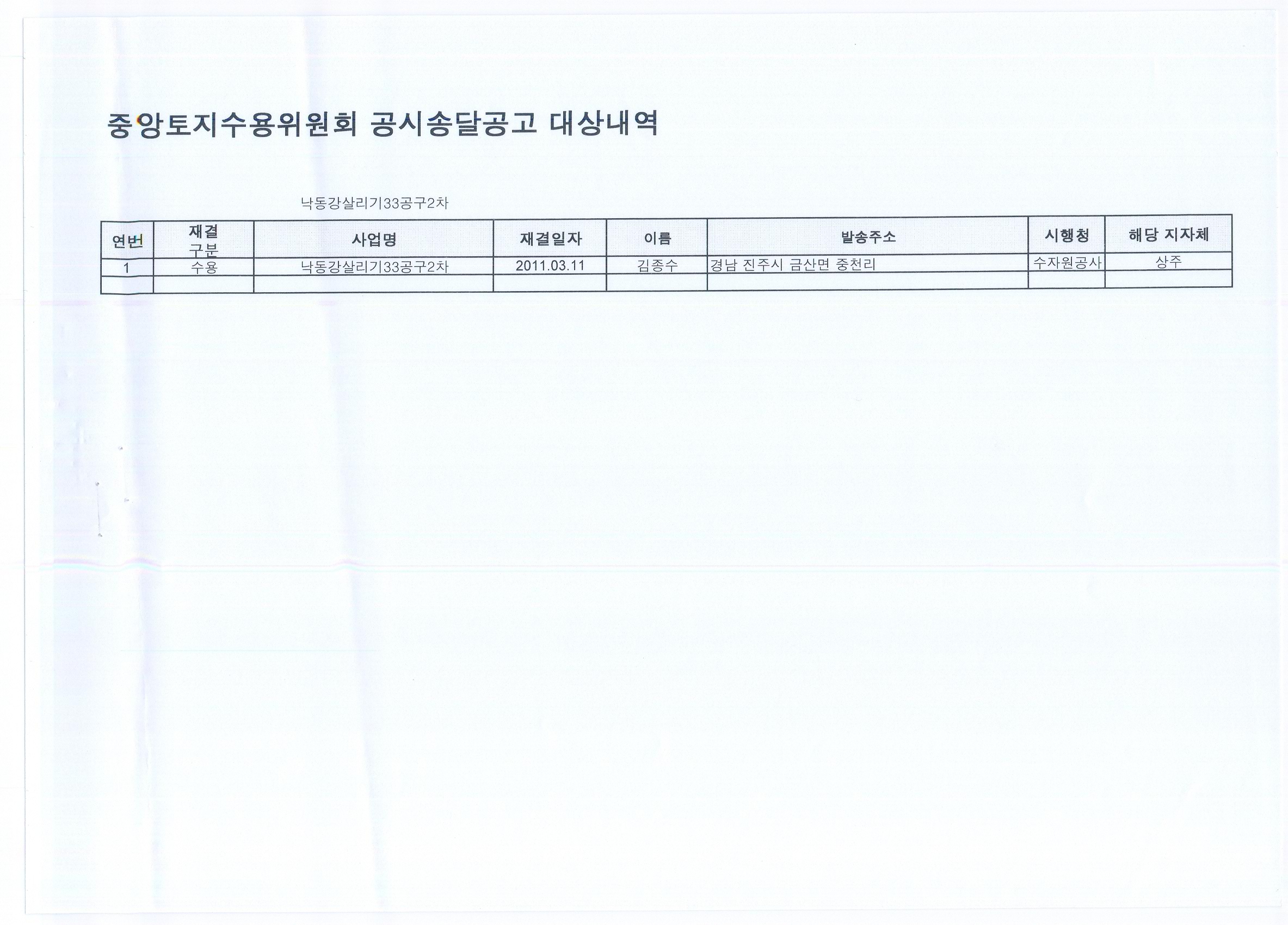 재결서 정본 공시송달(낙동강살리기 33공구 2차)