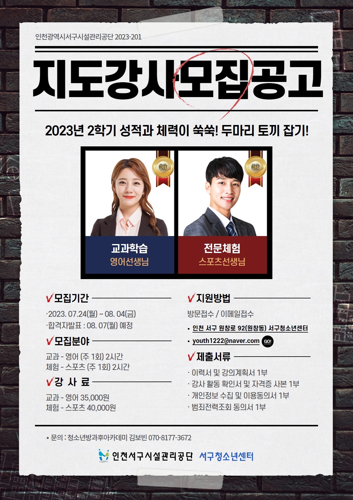 서구청소년센터 청소년방과후아카데미 2023학년도 2학기 지도강사 채용