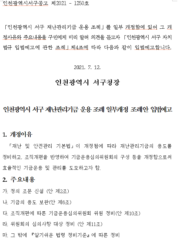 입법예고문_및_일부개정조례안(인천광역시_서구_재난관리기금_운용_조례_일부개정_조례안).hwp (144KByte)