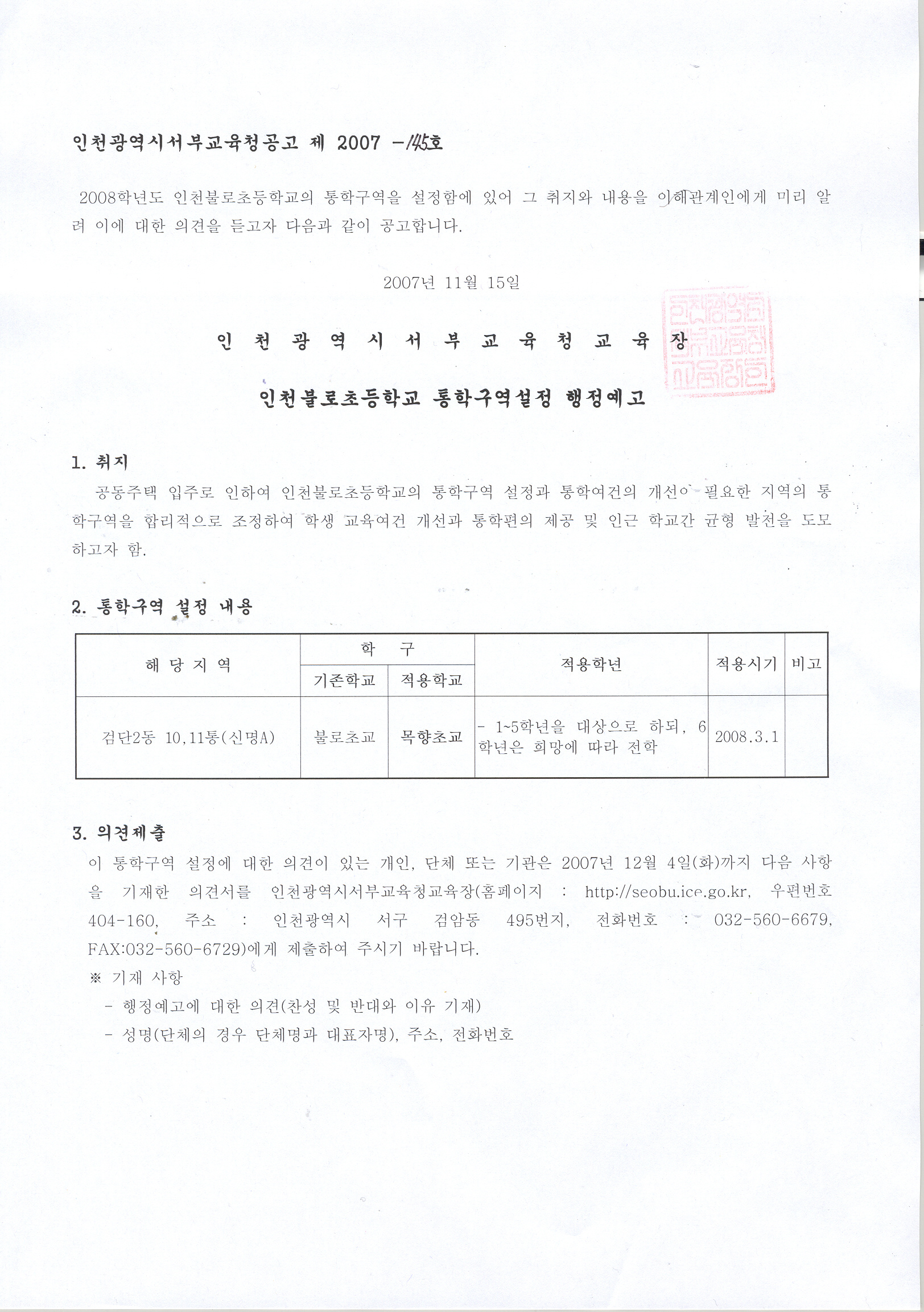 2008학년도 인천불로초둥학교 및 목향초등학교 통학구역을 재설정하였기에 이에 대한 의견을 듣고자 행정절차법 제46조의 교정에 의하여 다음과 같이 행정예고하오니 참조하시기 바랍니다.