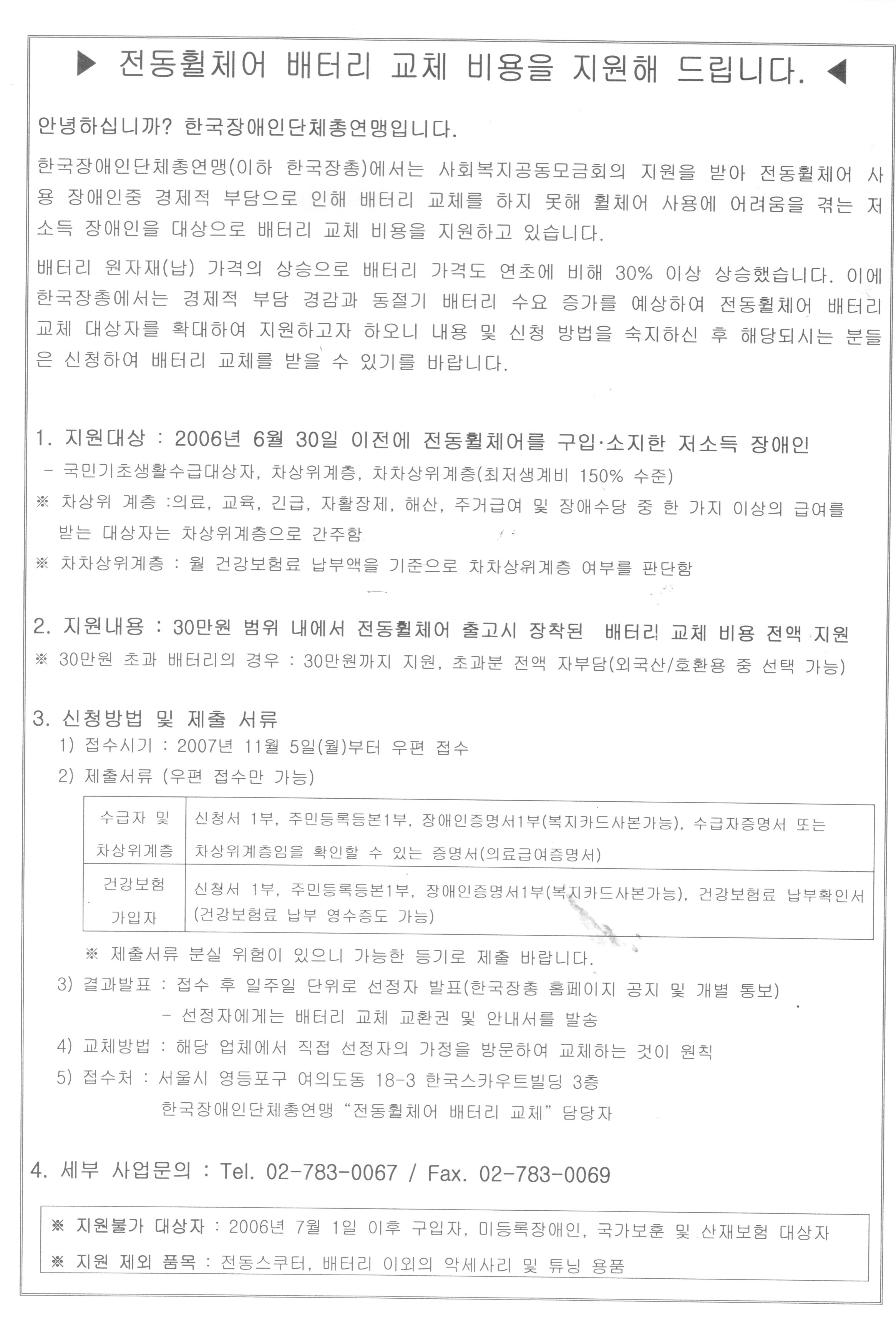 1. 지원대상 : 2006년 6월 30일 이전에 전동휠체어를 구입소지한 저소득 장애인