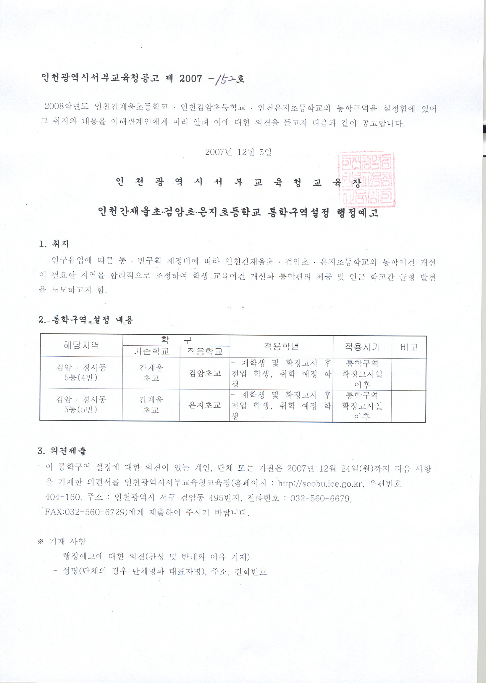 검암경서동 관내 인구유입에 따른 통·반구획 재정비에 따라, 아래와 같이 2008학년도 통학구역을 변경하고자 행정절차법 제46조의 규정에 의하여 행정예고 합니다.