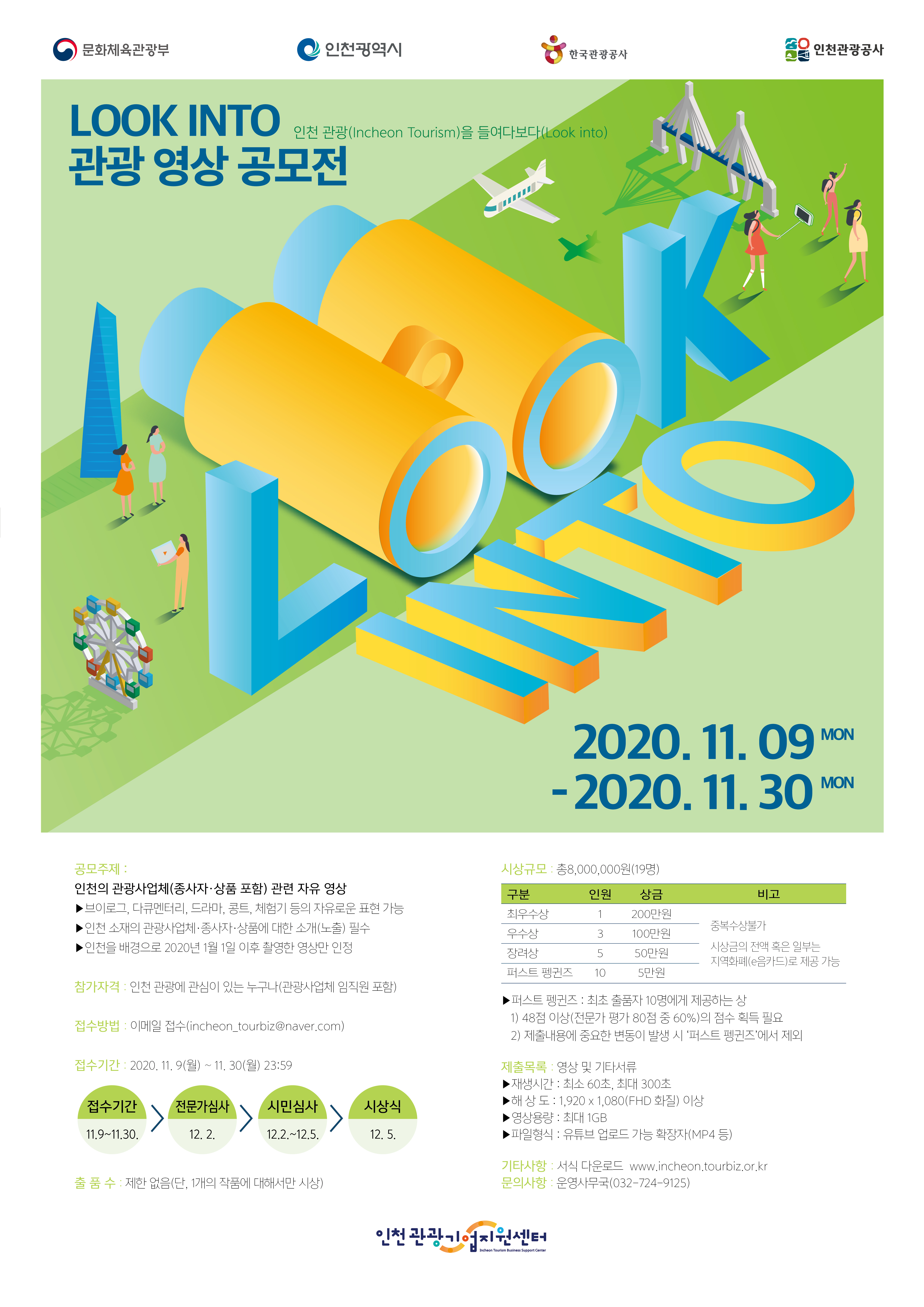 인천 관광기업지원센터에서 진행하는「LOOK INTO 관광 영상 공모전」의 개최를 알려드리오니 관심있는 분들의 많은 참여 바랍니다.