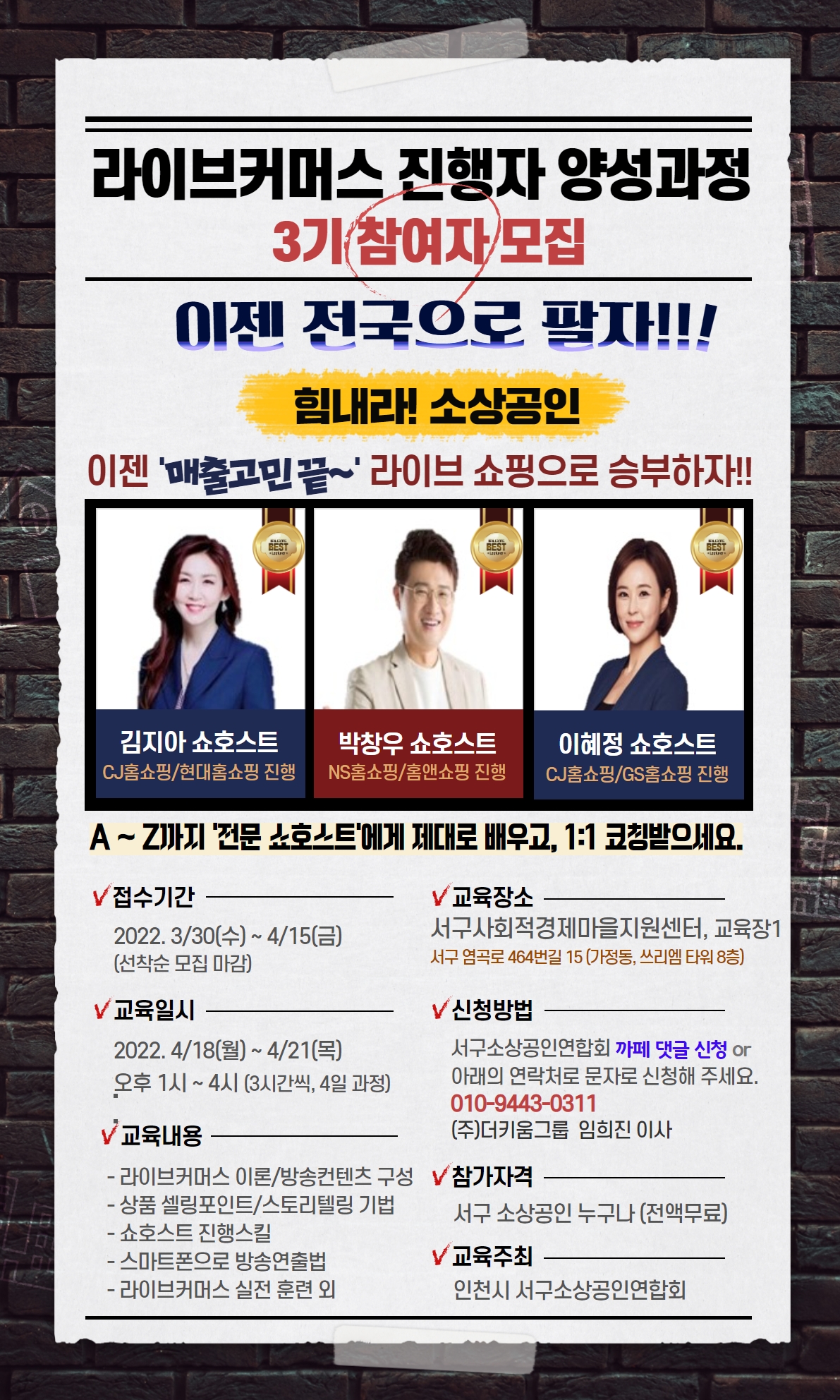 인천 서구 소상공인연합회에서 주관하는 라이브커머스 진행자 양성과정 3기 교육 안내입니다.