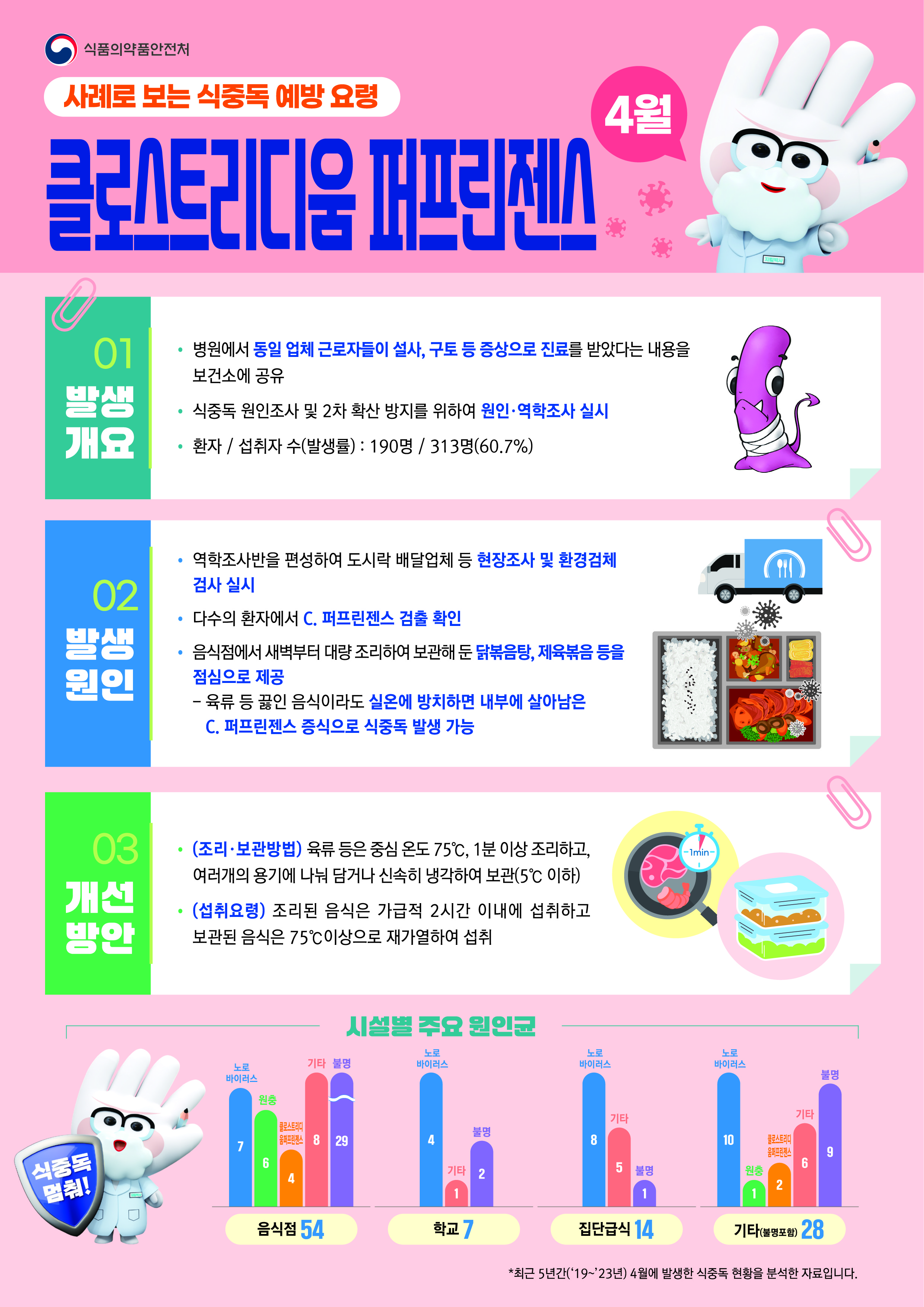 식중독 예방을 위해 최근 5년간 4월의 식중독 발생현황을 분석하여 위와 같이 식중독 주의 정보를 알려드리니 관련자 및 집단급식소, 음식점 영업주분들께서는 식중독 발생 예방에 참고하여 주시기 바랍니다.