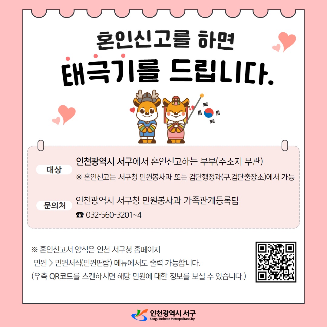 인천 서구에서 혼인신고하는 모든 부부에게 태극기를 드립니다.