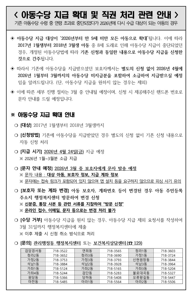 아동수당 지급 연령 확대 및 직권 처리 관련 안내
