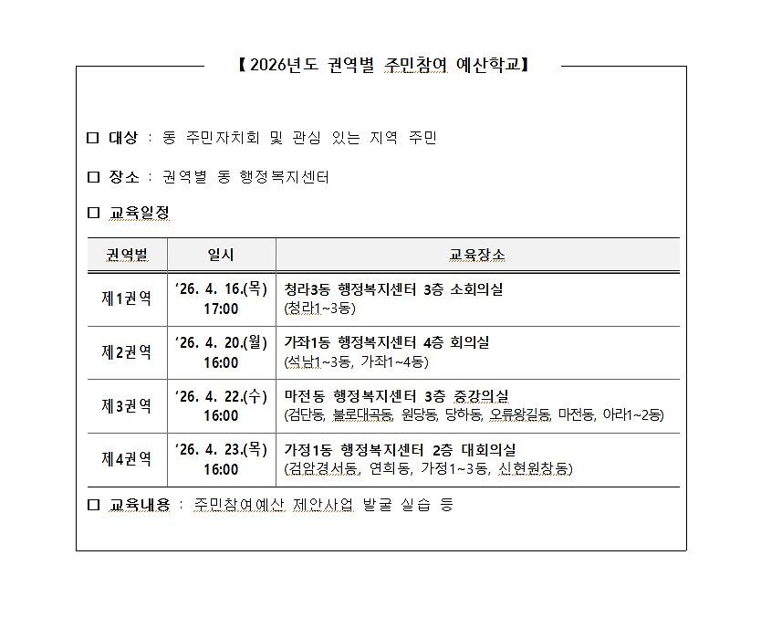다음과 같이 2026년도 권역별 주민참여 예산학교 일정을 안내하여 드리오니, 관심있는 주민께서는 일정을 확인하시고 참석하여 주시기 바랍니다.