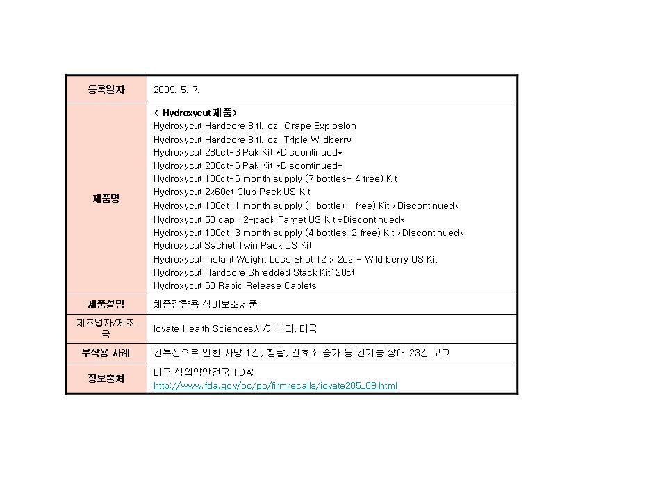 "하이드로시컷"제품이 인체(간)에 부작용을 일으킨다는 미국 식품의약국(FDA)의 경고
