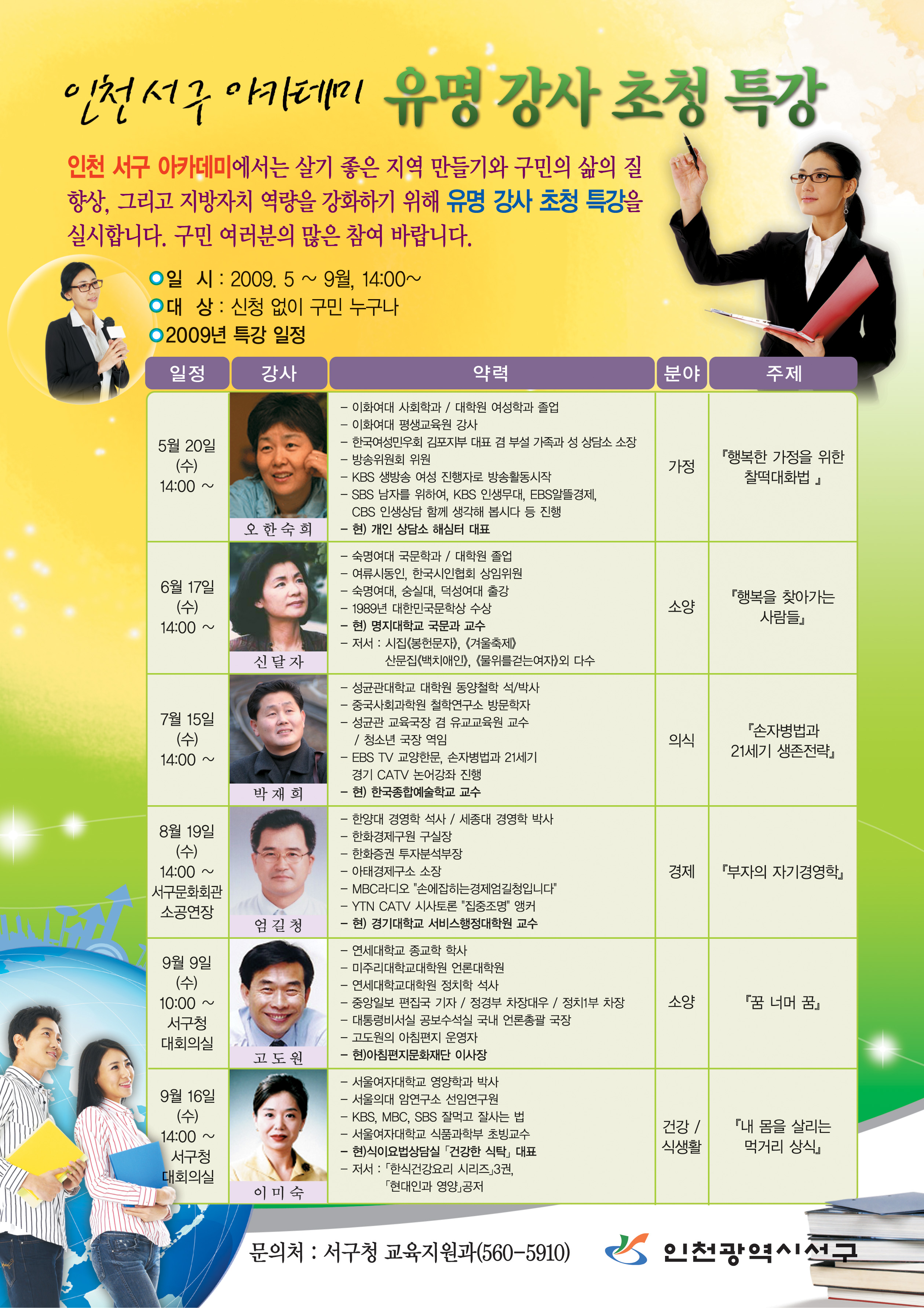 인천 서구아카데미, 유명 강사 초청 특강을 아래와 같이 운영하오니