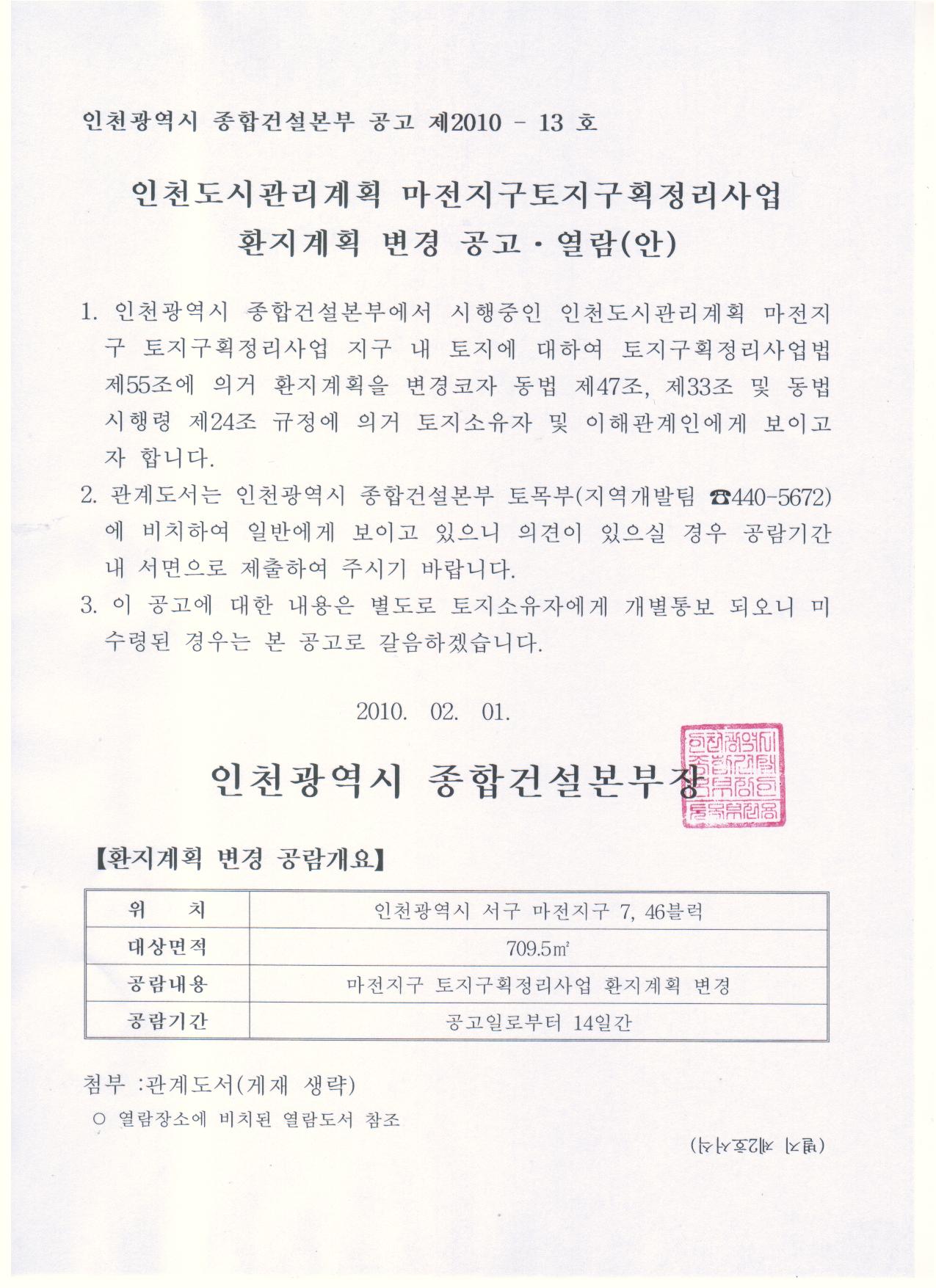 인천도시관리계획 마전지구 토지구획정리사업 환지계획 변경 공고 및 열람문을 붙임문서와 같이 공고합니다.
